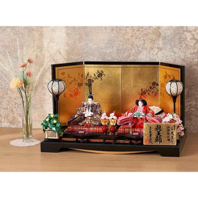 豪華な西陣織の金襴を使用したお人形を、煌びやかな雰囲気の飾り台と合わせた人気のおひなさまです。