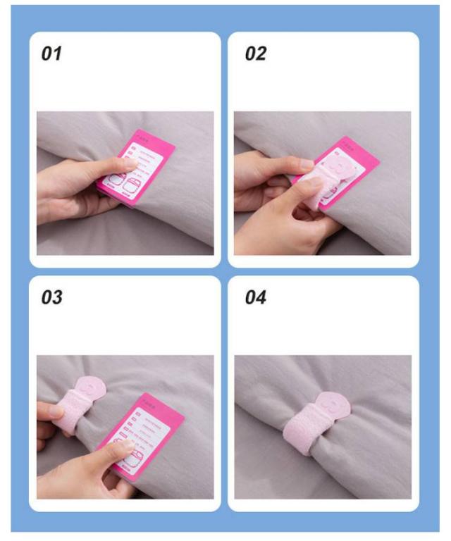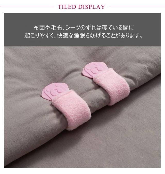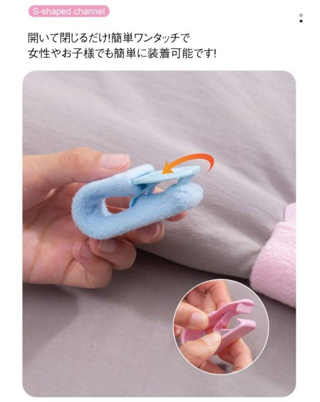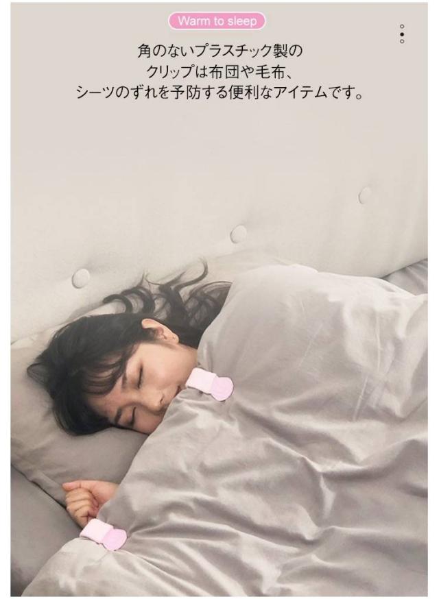 | 針を使わない、クリップ式で安心してお使いいただけます。 開いて閉じるだけ!簡単ワンタッチで女性やお子様でも簡単に装着可能です! 布団や毛布、シーツのずれは寝ている間に起こりやすく、快適な睡眠を妨げることがあります。 クリップを使用することで、布団やシーツをしっかりと固定し、ずれを防止することができます。 角のないプラスチック製のクリップは布団や毛布、シーツのずれを予防する便利なアイテムです。 | |