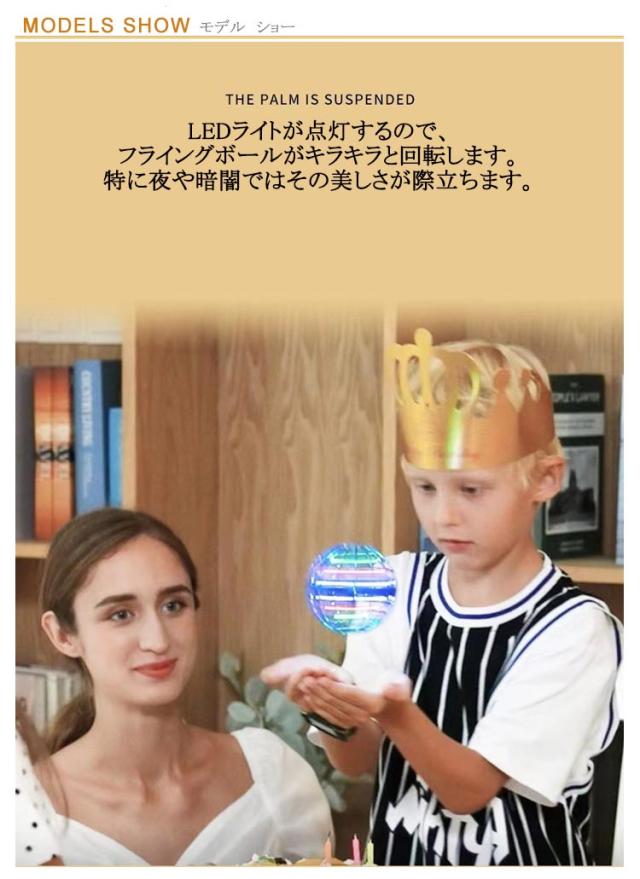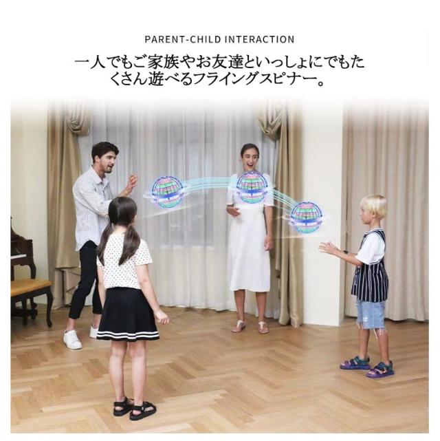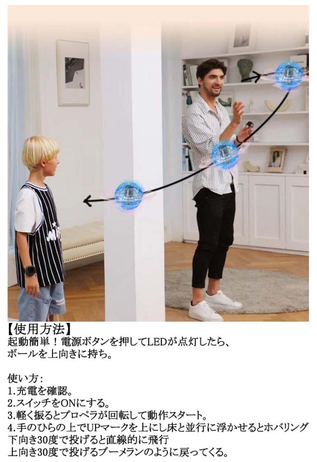 | 光る♪戻ってくるフライングボール。 ブーメランのように戻ってくるフライングボール、みんなでキャッチボールも◎ LEDライトが点灯するので、フライングボールがキラキラと回転します。特に夜や暗闇ではその美しさが際立ちます。 一人でもご家族やお友達といっしょにでもたくさん遊べるフライングスピナー。 【使用方法】起動簡単!電源ボタンを押してLEDが点灯したら、ボールを上向きに持ち。 使い方:1.充電を確認。 2.スイッチをONにする。 3.軽く振るとプロペラが回転して動作スタート。 4.手のひらの上でUPマークを上にし床と並行に浮かせるとホバリング 下向き30度で投げると直線的に飛行 上向き30度で投げるブーメランのように戻ってくる。 | |