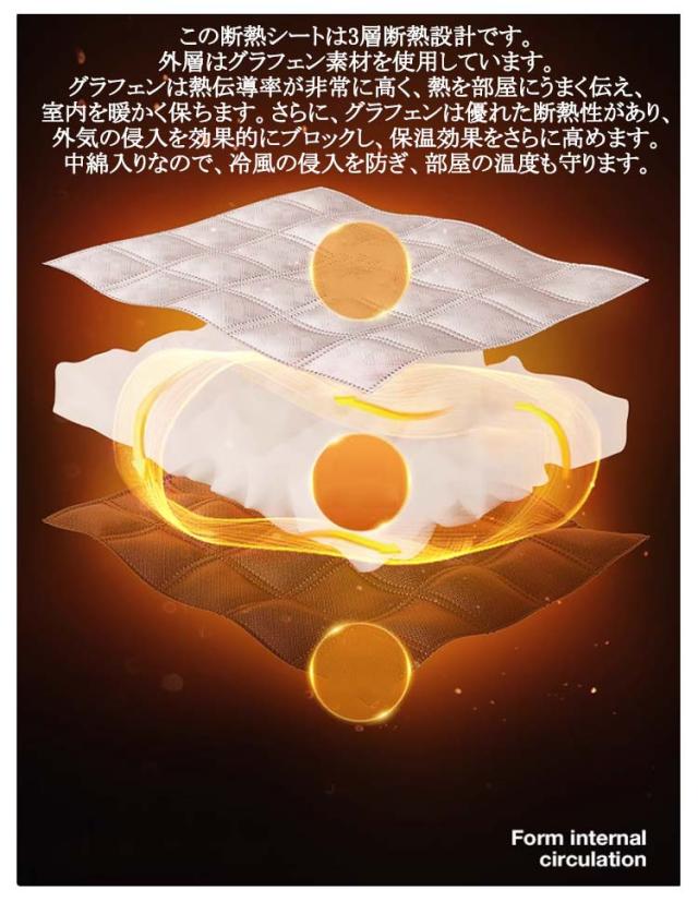 | 完全断熱・遮光!ロールアップ可能で換気しやすい。 冬用断熱窓カーテンは、お部屋の熱を保つように設計されており、防風、防水、防塵、防音、遮光、保温、プライバシー保護の機能を備えており、冬に冷気が部屋に入るのを防ぎ、夏には暖かい空気を遮断します。 この断熱シートは3層断熱設計です。外層はグラフェン素材を使用しています。グラフェンは熱伝導率が非常に高く、熱を部屋にうまく伝え、室内を暖かく保ちます。さらに、グラフェンは優れた断熱性があり、外気の侵入を効果的にブロックし、保温効果をさらに高めます。中綿入りなので、冷風の侵入を防ぎ、部屋の温度も守ります。 マジックテープ付き、取付簡単!窓枠に貼るだけで、冷暖房効果が上がるので節電にもなります。 | |