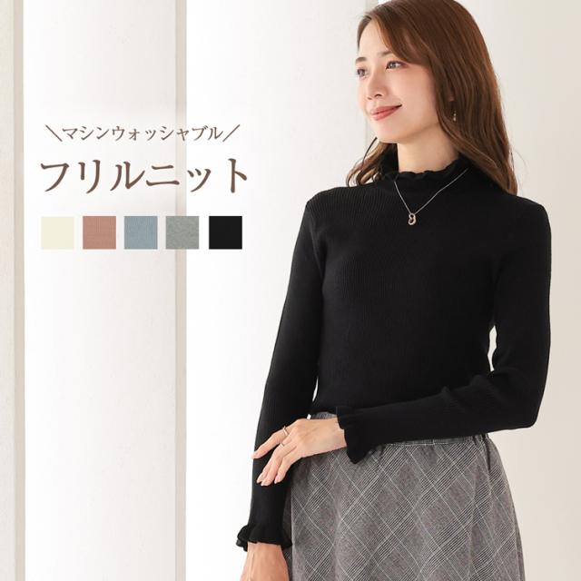 フリルネック ハイネック ニット セーター タートルネック リブニット レディース ハイネックニット リブ タートルニット トップス 冬 秋 長袖 無地 カシミヤタッチ ボトルネック オフィス カジュアル きれいめ くすみ ピンク ブルー 黒 白 暖かい