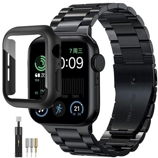 【保護ケース付き】PC素材と硬度強化ガラスで作成された 一体型 apple watch カバー。360度で腕時計を落下衝撃や傷から全面的に保護。バンド横3列になったコマを縦に繋ぎ合わせたブレスレットで、高い堅牢性を持っています。ほとんどの時計メーカーで採用されている3コマモデルで、金属ブレスとしては一番オーソドックスなタイプになります。
