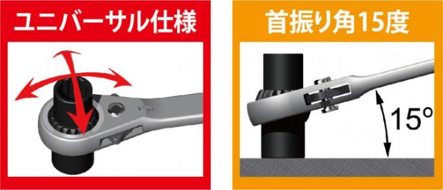 商品詳細:一本で4サイズ対応可能なギアレンチ。球状ギアがユニバーサルな作業を実現しました。首振り角15度で、狭い箇所や回しにくいフラットな箇所での作業も楽に。本締めも可能です。 生産国:中国 素材・材質:本体:ステンレス・カーボンスチール、ギア部:CR-V(クロームバナジウム鋼) 商品サイズ:H205×W42×D25mm 重量:316g 仕様:・13/17/19/21mmに対応