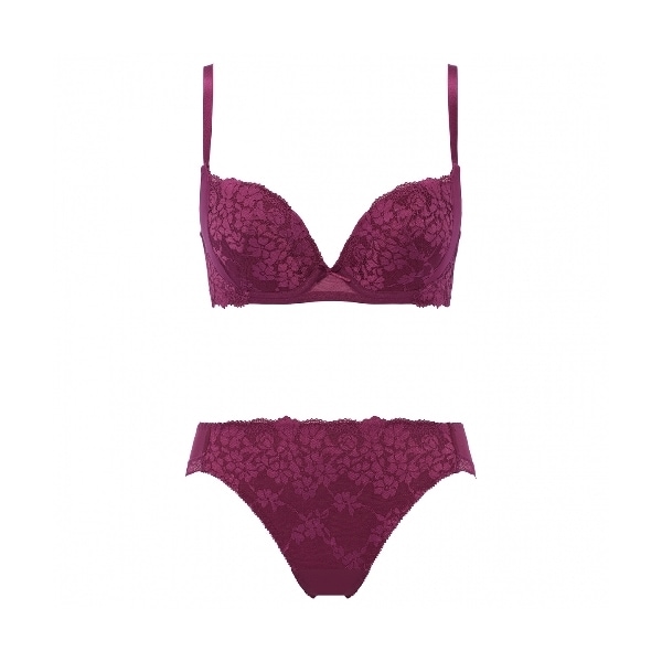 チューリップやデイジーなど、様々な花を集めたブーケ柄の編みレースを配したデイリーに使いやすいブラ&ショーツセットです。
