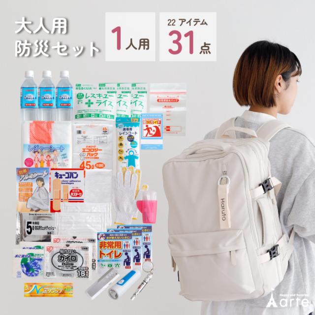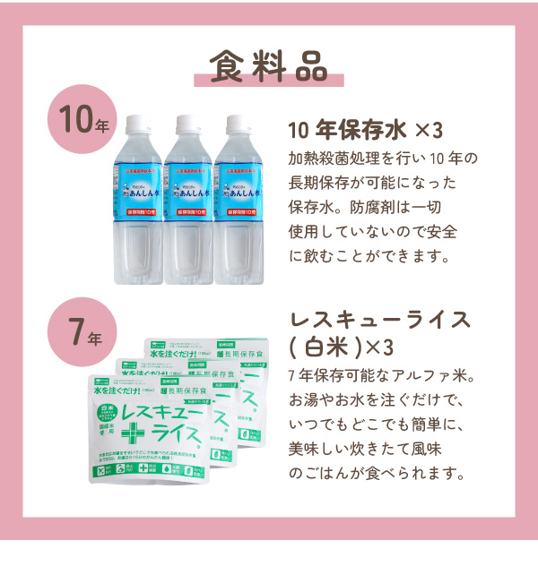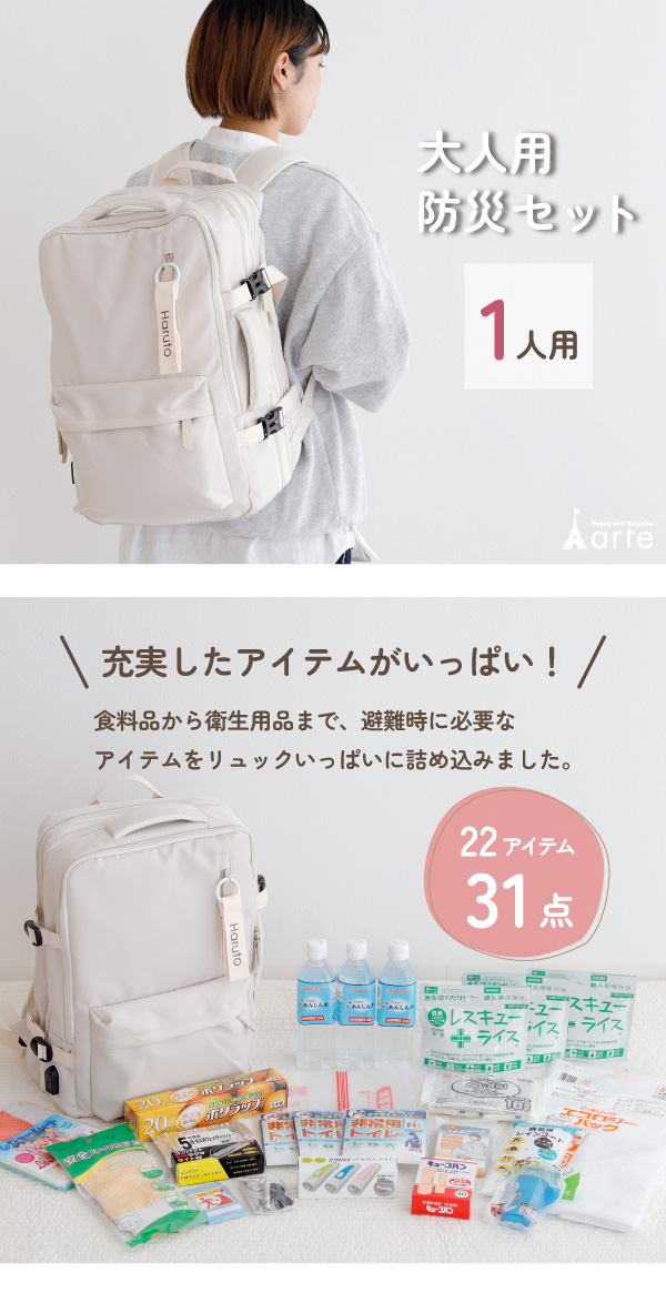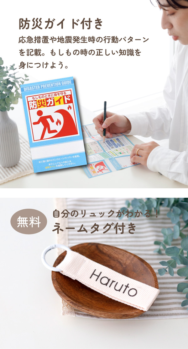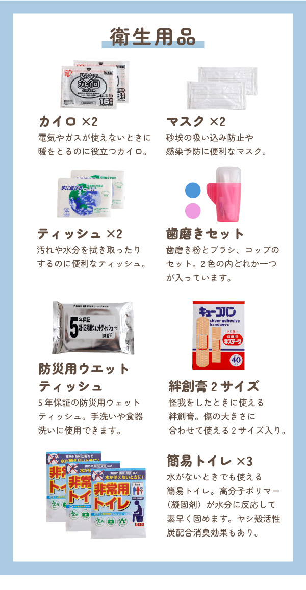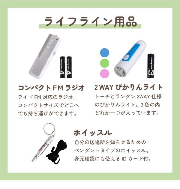 | セット内容 | ・ネームタグ付きリュック ・レスキューライス×3 ・10年保存水500ml×3 ・コンパクトFMラジオ×1 ・ラジオ用電池単4×2 ・2WAYぴかりんライト×1 ・ライト用電池単3×1 ・レジャーシート1畳用×1 ・アルミシート×1 ・ホイッスル×1 ・簡易トイレ×3 ・給水袋5L×1 ・絆創膏2サイズ40枚×1 ・タオル×1 ・軍手×1 ・ごみ袋45L10枚入り×1 ・ポリラップ15cm20m×1 ・防災用ウエットティッシュ20枚×1 ・レインコート×1 ・カイロ×2 ・マスク×2 ・ティッシュ×2 ・歯磨きセット×1 ・防災ガイド×1 |