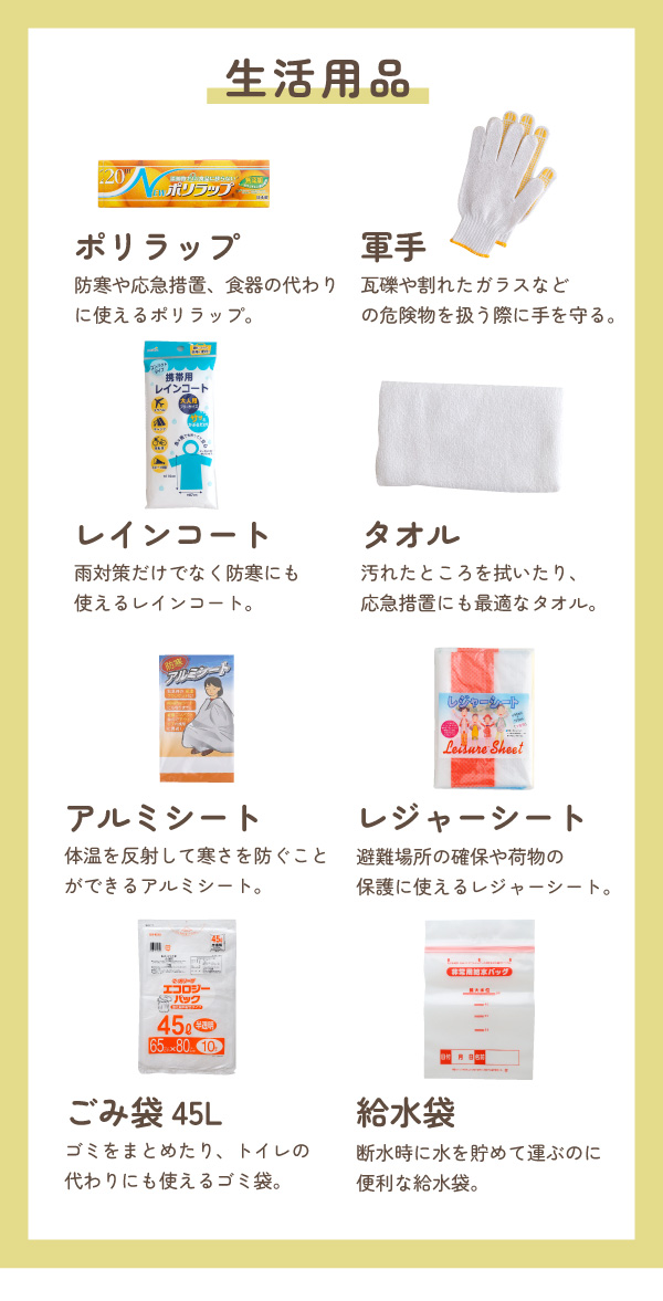 災害時に必要な食料や水、ライト、救急セットなどの基本アイテムを完備。