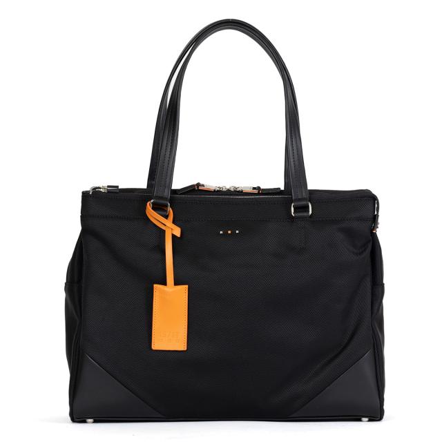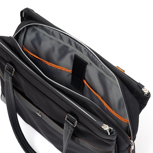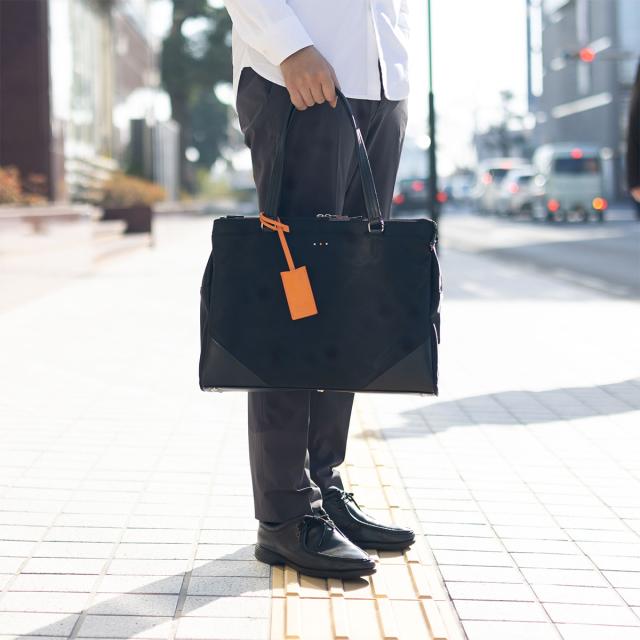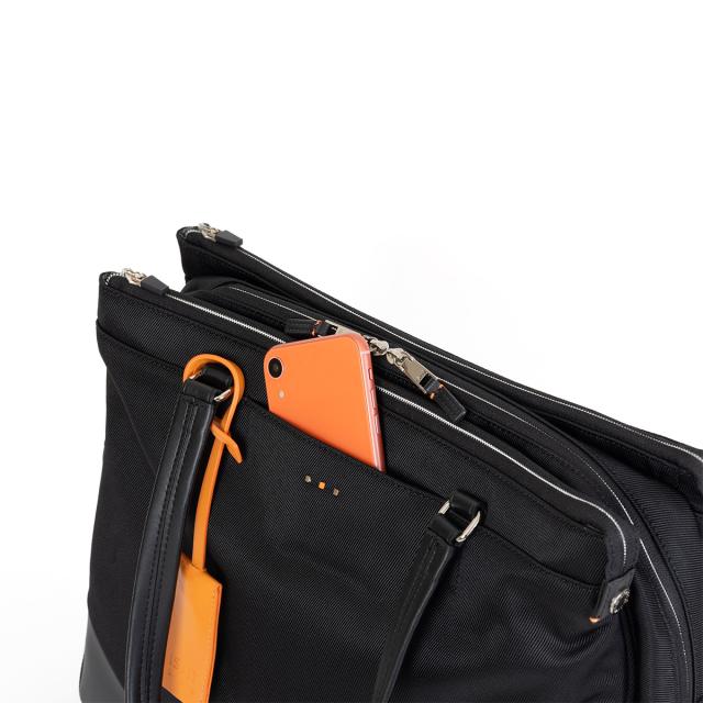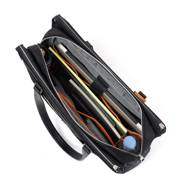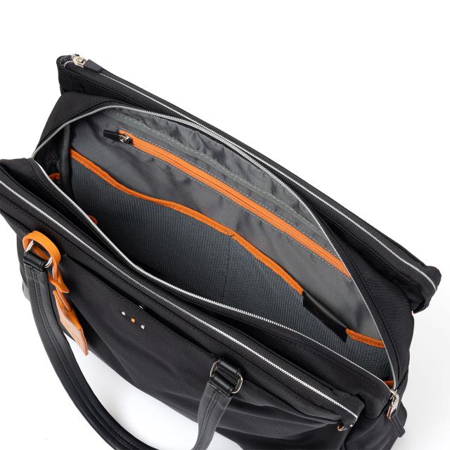 雨や汚れにも強く、機能的な3層構造のB4ジャストサイズトートバッグ。コンパートメント部が前・中央・後側と3層構造になっており、収納機能が抜群。細かな荷物も分けて整理することができます。中央のメインコンパートメントは、ファスナーがフルに開くため荷物の出し入れが容易です。B4書類ジャスト・15.6インチPCが収納できるサイズです。