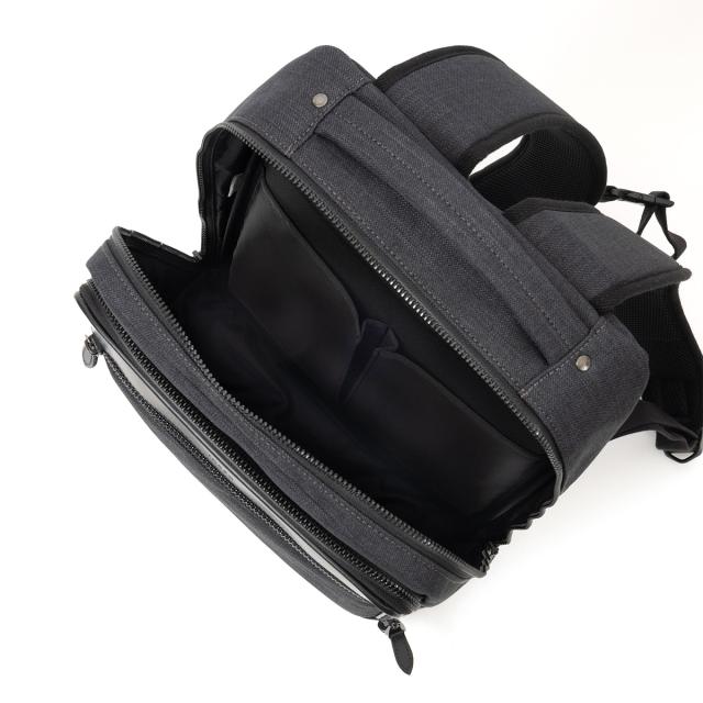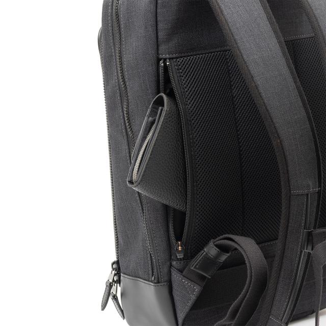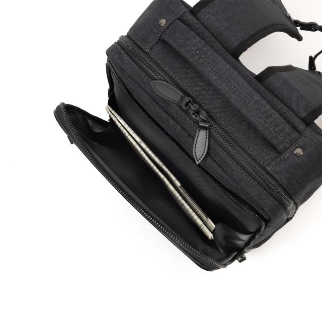 本体素材はスーツやジャケットなどの服地で使われている杢調ポリエステルを使用しています。フォーマルに近いこの素材は上品な雰囲気を演出することができます。また表面に撥水加工を施しているので安心して気軽に使えるので様々なシーンで活躍できる素材です。
