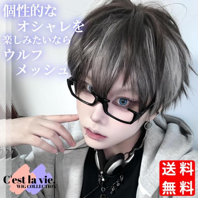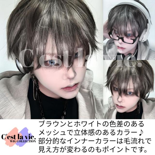 ウィッグ ショート ウルフ メッシュ ブラウン ホワイト フルウィッグ 前髪あり 医療用 かつら ネット付き 自然 バレない 普段使い 即日出荷 送料無料