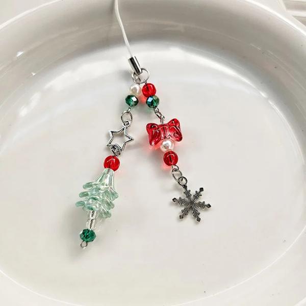 かわいい蝶ネクタイビーズのクリスマスツリーキーホルダー電話用、女の子のバッグ用のトレンディなキーホルダー、イヤホンケース、クリスマスペンダントアクセサリー、2020