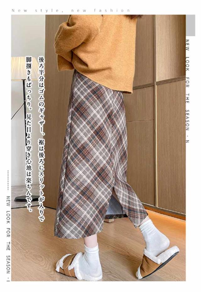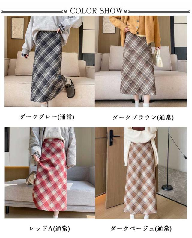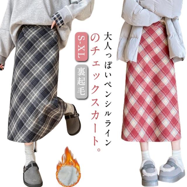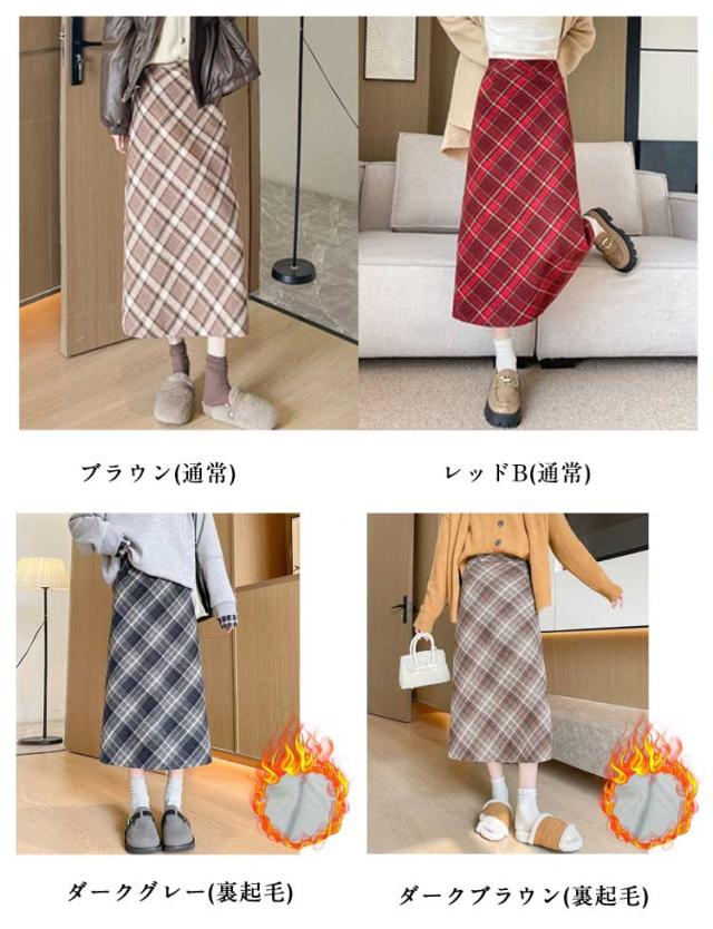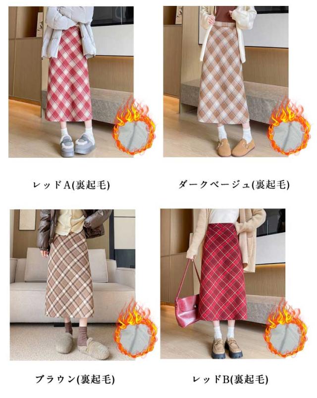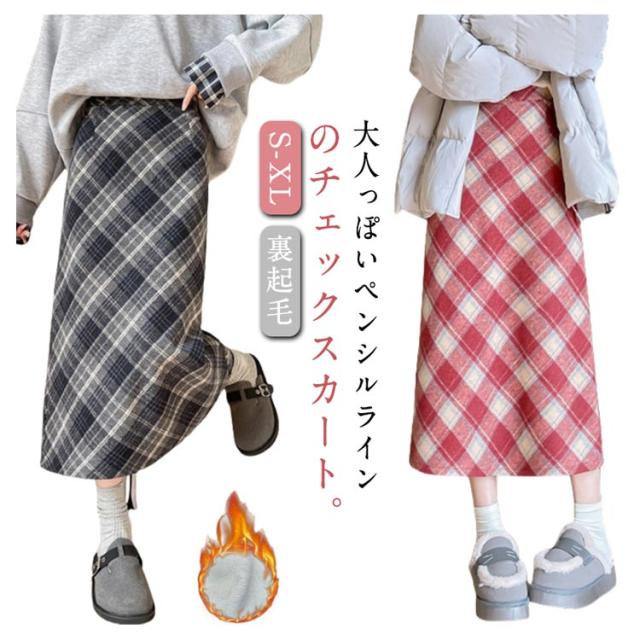 チェックスカート レディース Iライン ロングスカート 裏起毛 通常 秋 冬 暖かい ボトムス タイトスカート 厚手 防寒 ウエストゴム 上品 体型カバー ゆったり 通勤 通学 フォーマル