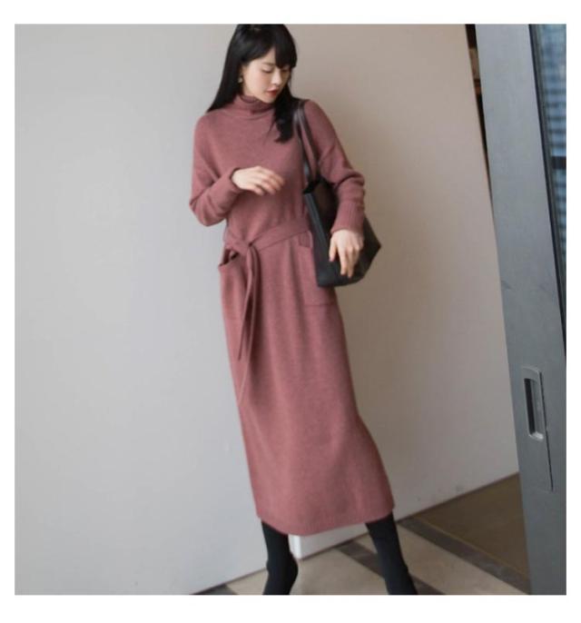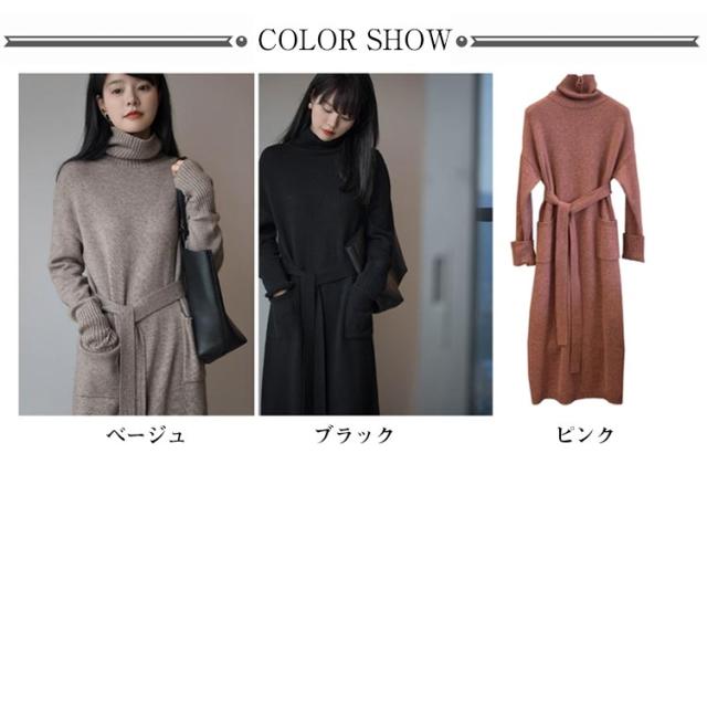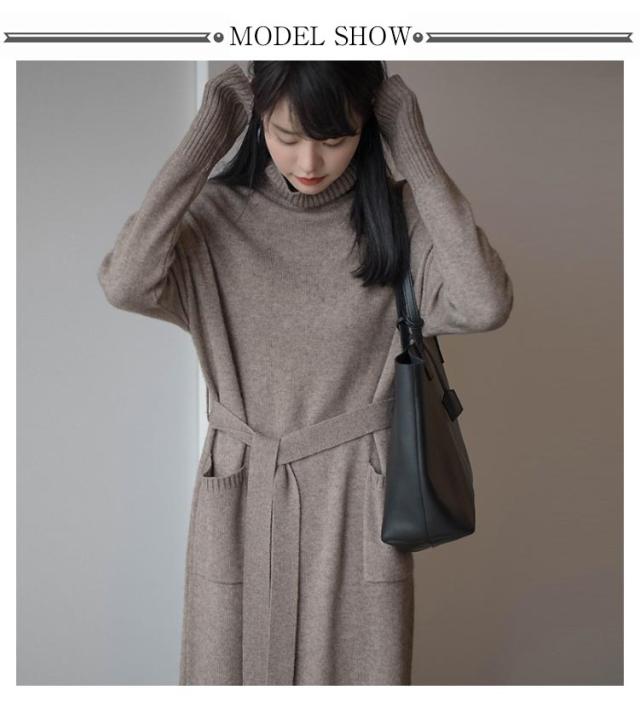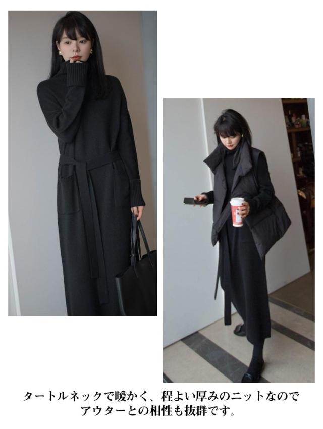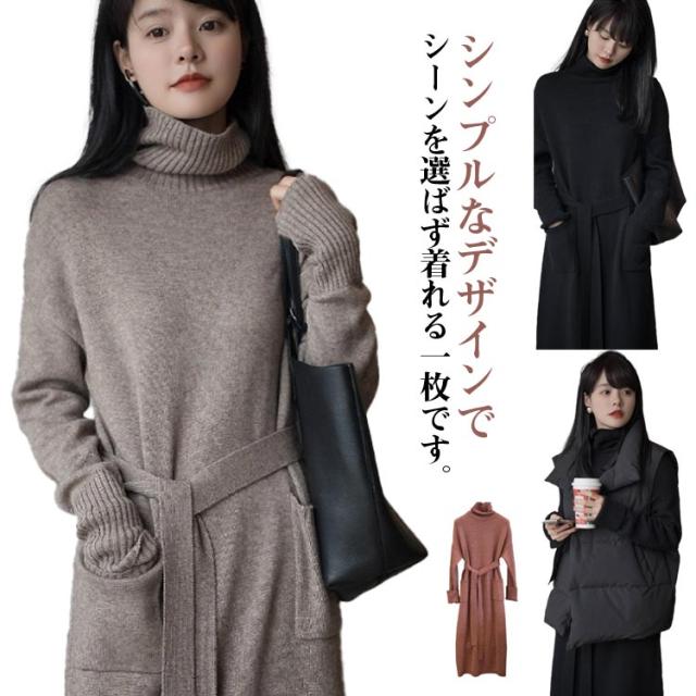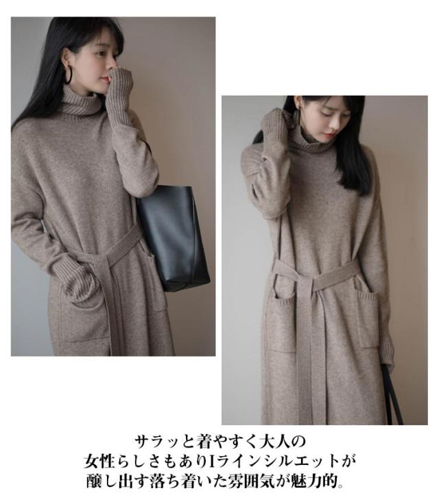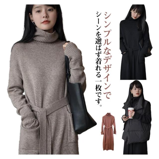 ベルト付き タートルネック 長袖 ウエストマーク ロング シンプル セーター 体型カバー 柔らかい ロング丈 ゆったり レディース カジュアル 普段着 柔らか 暖か 女性らしい 通勤 ニットワンピース 秋