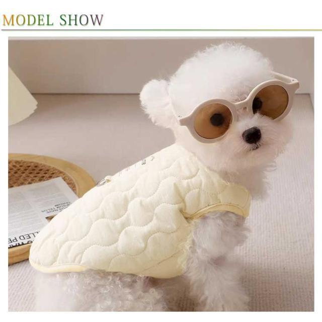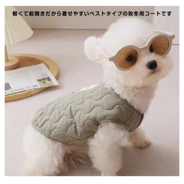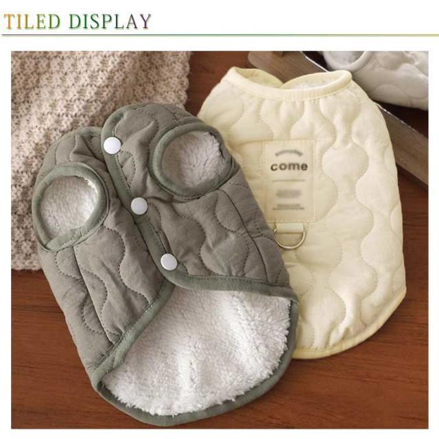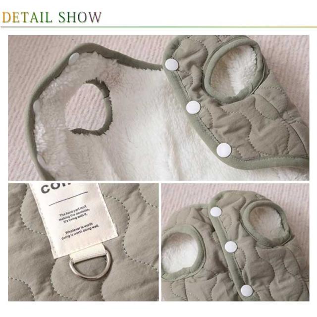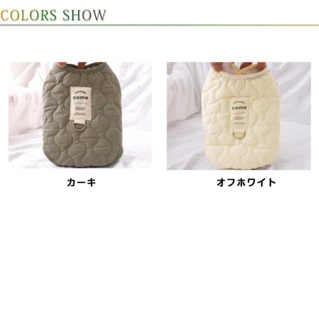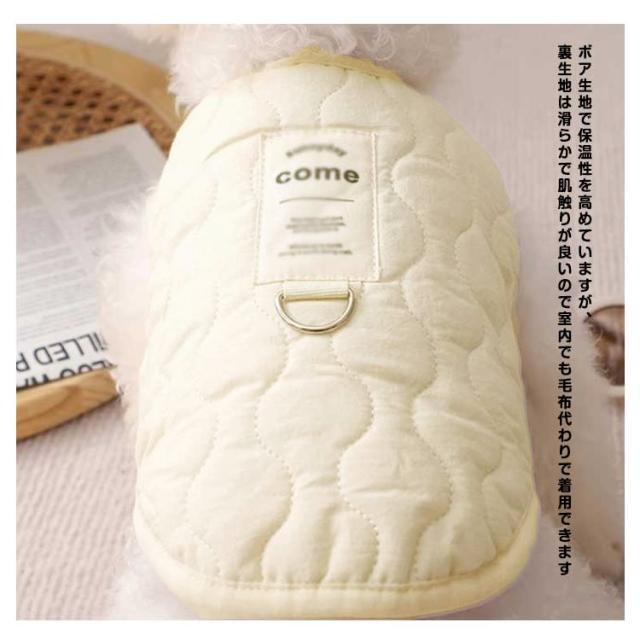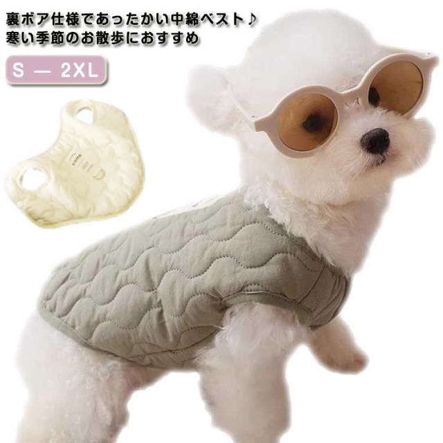 | 裏ボア仕様であったかい中綿ベスト♪ 寒い季節のお散歩におすすめ 軽くて前開きだから着せやすいベストタイプの秋冬用コートです 袖なしだから着せやすく手の短い犬種にもピッタリです ボア生地で保温性を高めていますが、裏生地は滑らかで肌触りが良いので室内でも毛布代わりで着用できます 毛まみれを避けるのために部屋着として使え、着やすいし、わがままなペットちゃんに脱着ことが易くなります。 | |