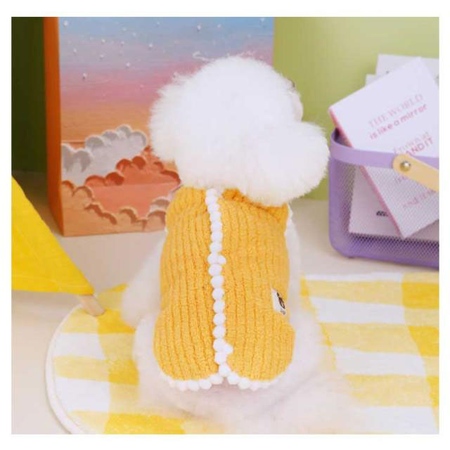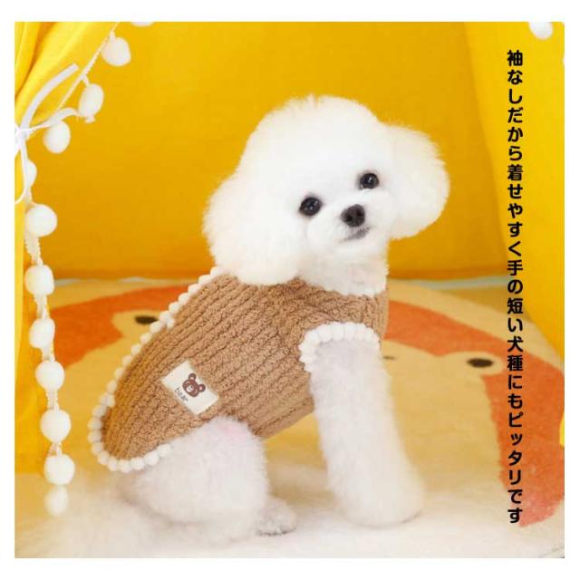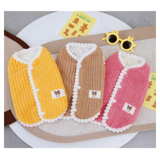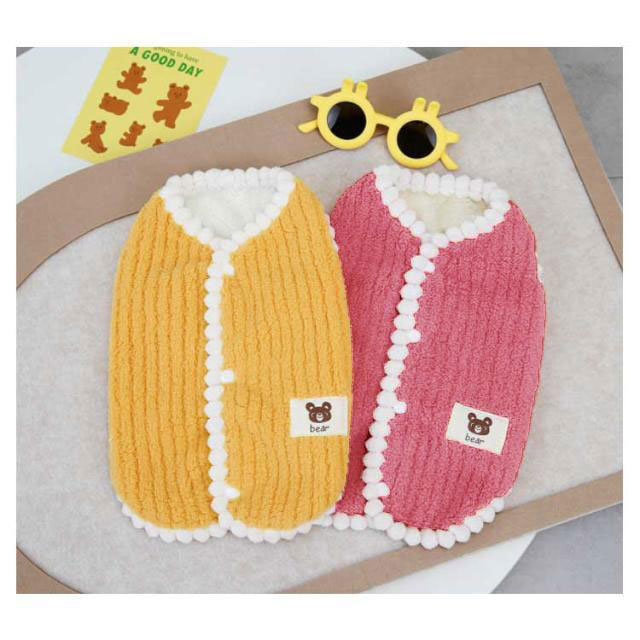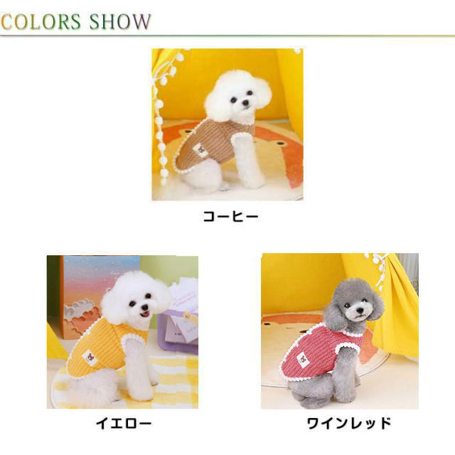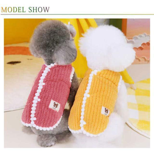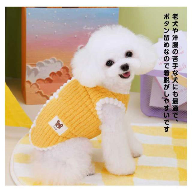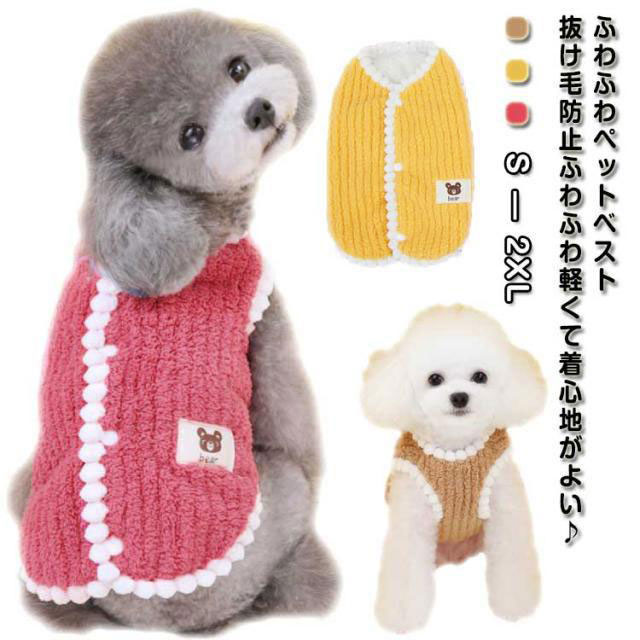| ふわふわペットベスト 抜け毛防止ふわふわ軽くて着心地がよい♪ 軽くて前開きだから着せやすいベストタイプの秋冬用コートです ボア生地で保温性を高めていますが、裏生地は滑らかで肌触りが良いので室内でも毛布代わりで着用できます 老犬や洋服の苦手な犬にも最適で、ボタン留めなので着脱がしやすいです 袖なしだから着せやすく手の短い犬種にもピッタリです 襟がないデザインなので首輪の邪魔にならず、胸毛も絡まりにくいです | |