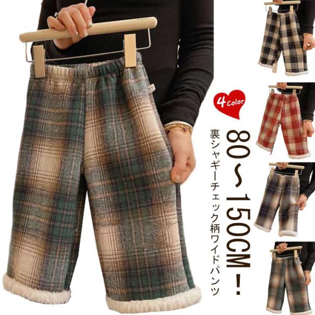 | 80〜150cm!裏シャギーチェック柄ワイドパンツ 裏地はシャギー素材で保温性に優れていて毛布のようにあたたか◎ 厚手で暖かく、寒い季節の通園・通学に重宝します。 ウエスト部分はゴム仕様になっており、着替えもスムーズにすることができます。 | |