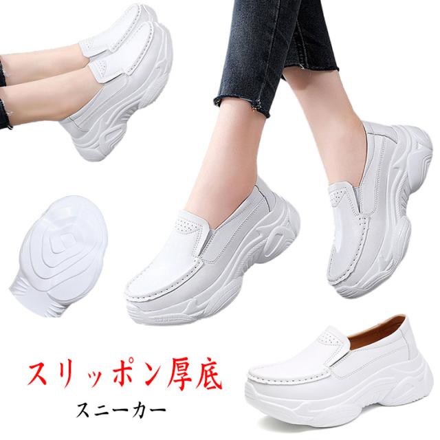 通勤 ホワイト レディース スニーカー 5cmヒール 厚底 サイドゴア ウォーキングシューズ スリッポン 通学 厚底スリッポンシューズ 柔か 合皮