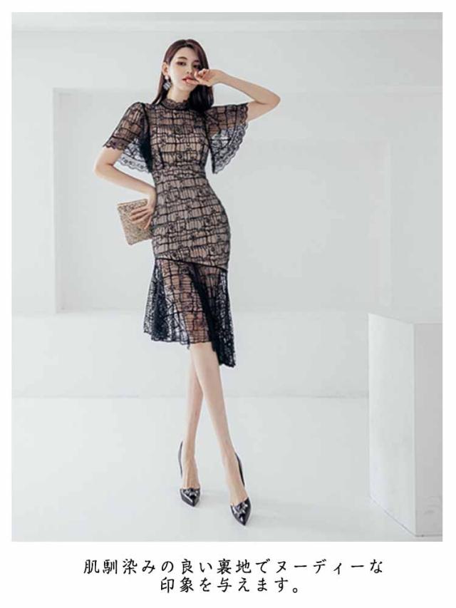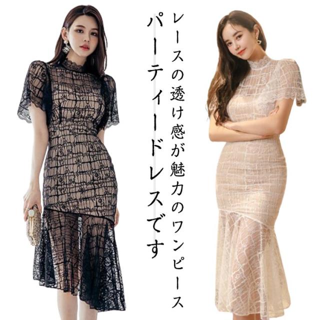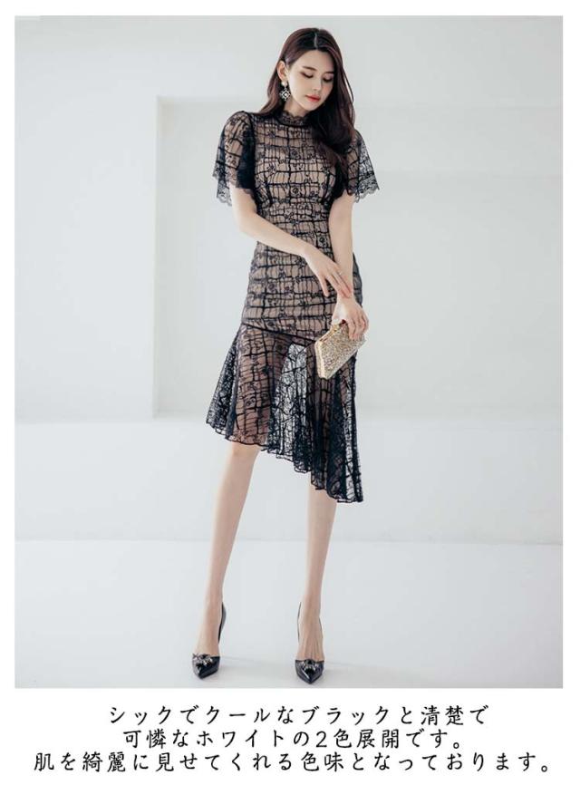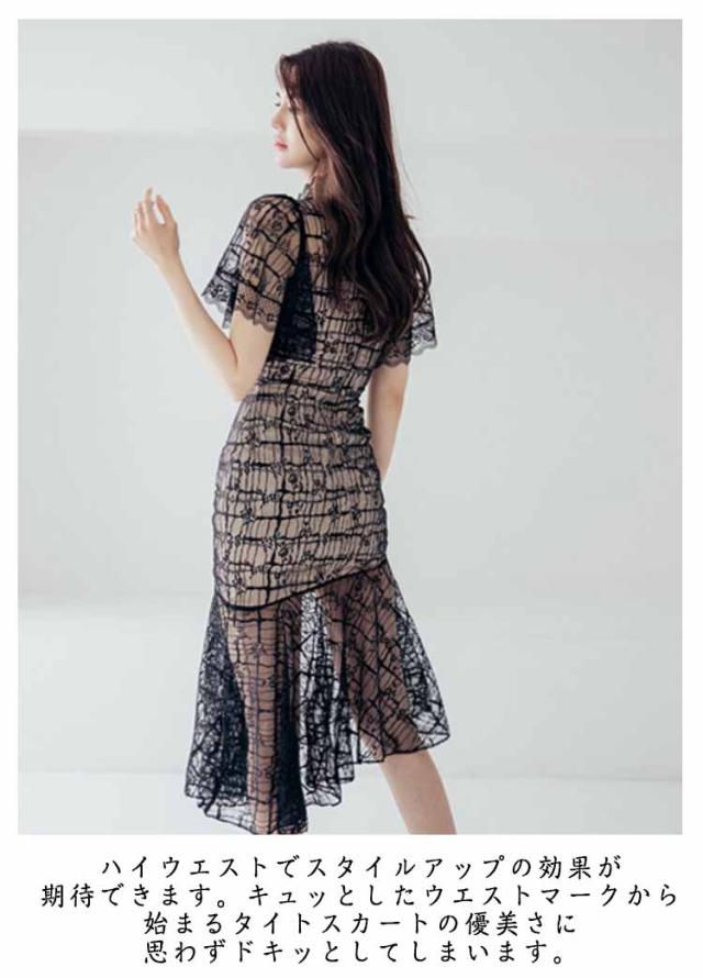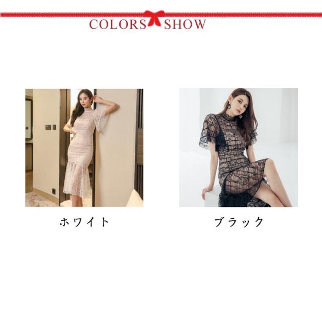 総レース ミモレ丈 ワンピース ミディアム丈 結婚式 膝下 きれいめ レディース 半袖 ナイトドレス キャバ 総レース パーティー 二次会 タイトワンピース パーティードレス 刺繍 ハイウエスト 白 黒 ホワイト ブラック 秋冬