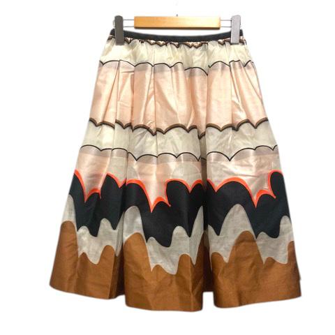 【中古】チェスティ Chesty スカート フレア ギャザー チュール 総柄 ひざ丈 0 白 アイボリー 黒 ブラック レディース