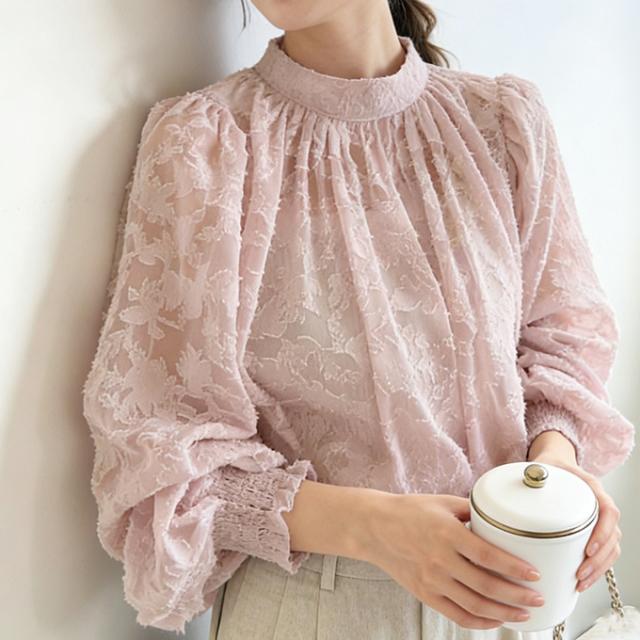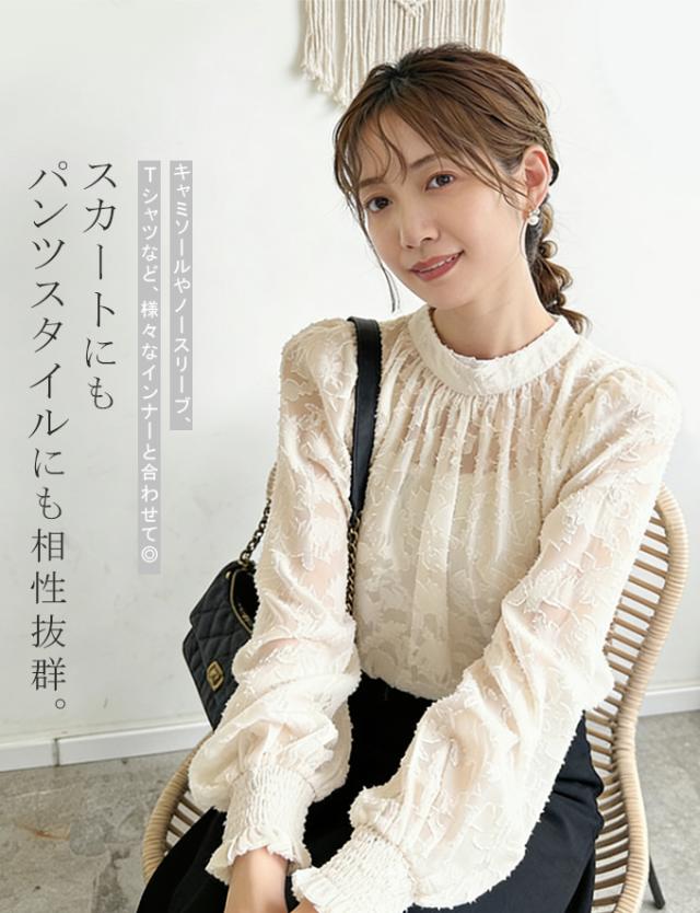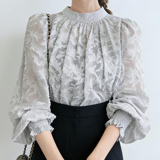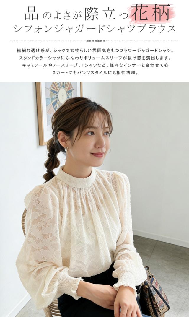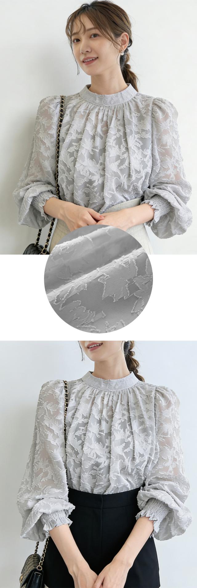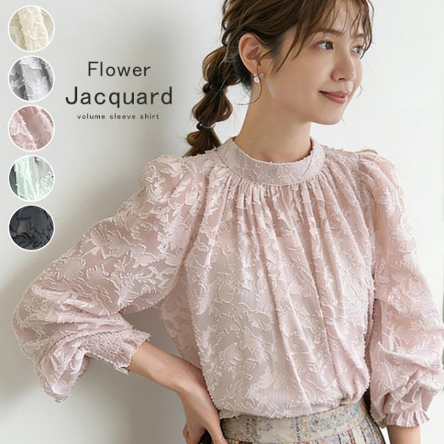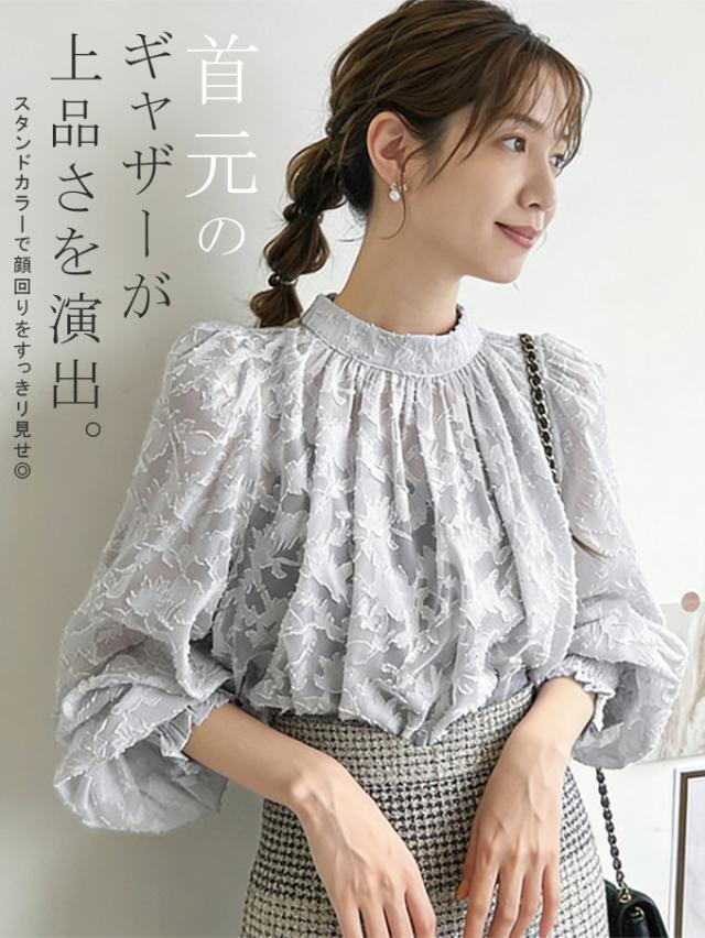ジャガードシフォンブラウス ボリューム感トップス スタンドカラー レディース おしゃれ トップス シャツ ブラウス シアー ジャガード 花柄 オーバーサイズ 羽織り レイヤード ゆったり
