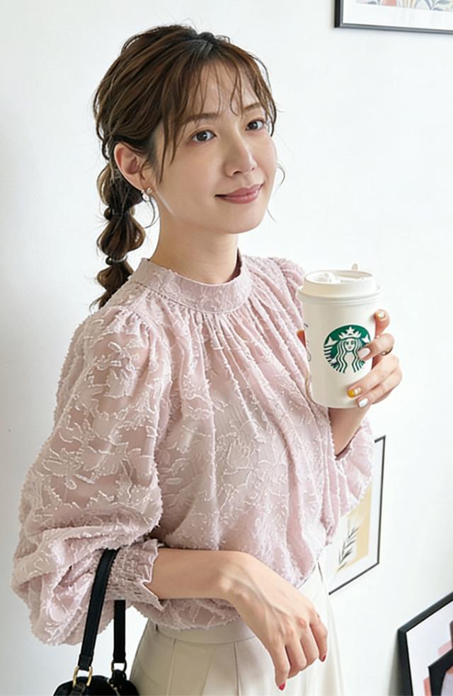 スタンドカラーシャツにふんわりボリュームスリーブが抜け感を演出します。