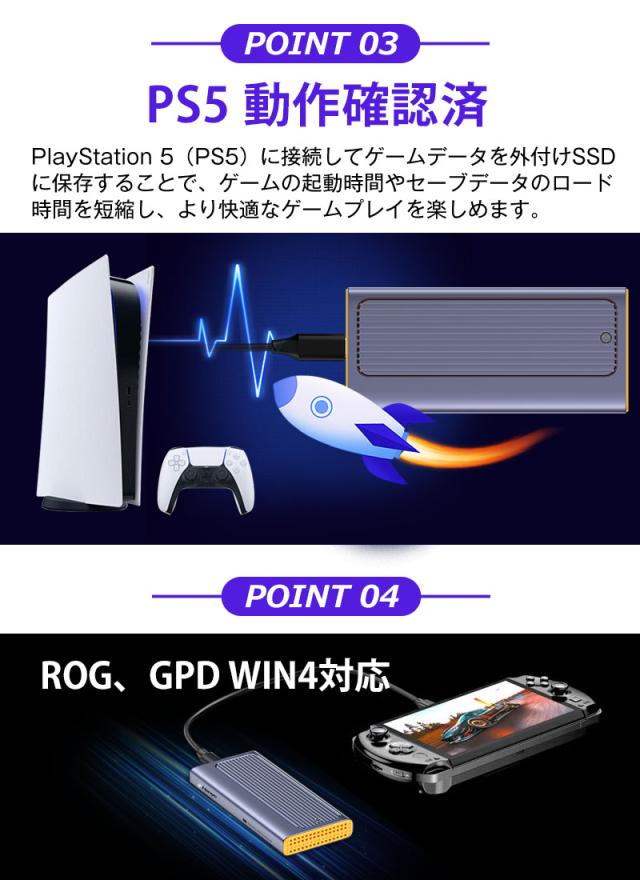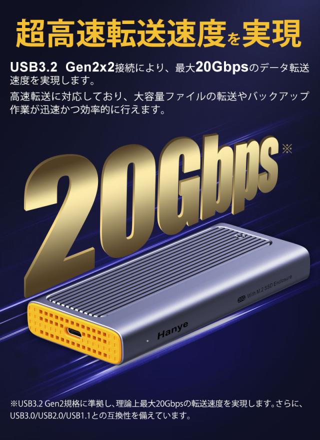 USB3.2 Gen2接続およびUASP高速転送モードに対応しており、USB3.0に比べてデータ転送速度が4倍に向上し、最大20Gbpsの高速転送が可能です。