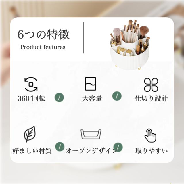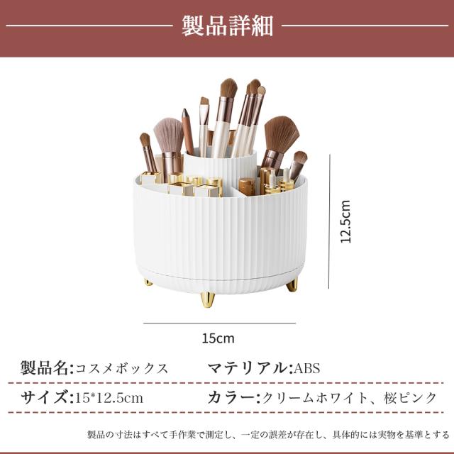 【高品質な素材】高品質のABS素材で作られており、変な匂いがする心配はございません。水で洗い可能で清潔やすいです。【回転式デザイン】360°回転式で、取り出しやすい。細かく仕切られている上部プレート、コスメやメイク道具など小物を整理して収納できる便利な卓上収納。【大容量で収納力抜群】普通のメイク収納ケースより大きく、口紅、メイクブラシ、マニキュア、フレグランスなどのメイク用品とスキンケア用品を全て収納できます。【幅広い適用性】化粧品やアクセサリー、メイク道具、小物、どの収納にとっても便利です。リビングにおいても、化粧台においても、洗面台に置いてもどこでもたっぷり収納できてパッと欲しいものが見つかります。【注意事項】サイズ詳細等の測り方はスタッフ間で統一、徹底はしておりますが、実寸は商品によって若干の誤差(1cm〜3cm )がある場合がございますので、予めご了承ください。