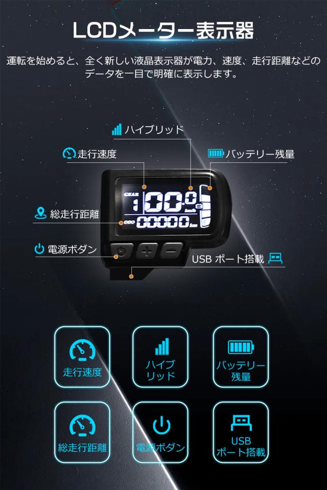 - クリアなLCDディスプレイにより、速度、バッテリー残量、走行距離などの重要な情報がリアルタイムで表示され、走行状態を簡単に把握できます。