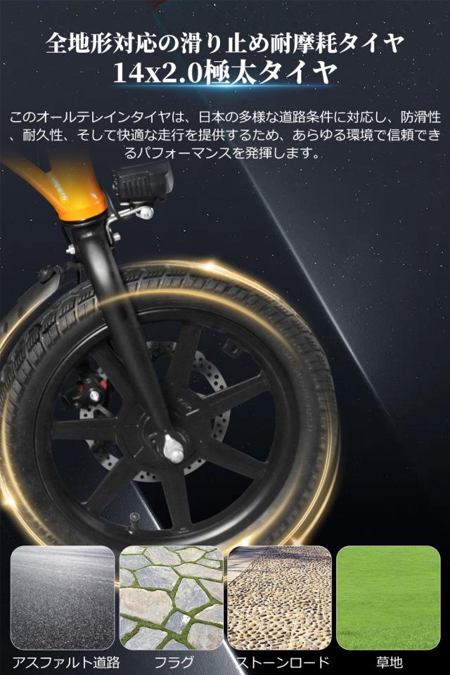 14x2.0ファットタイヤで、耐摩耗性が高く、優れたグリップ力で様々な路面に対応します。