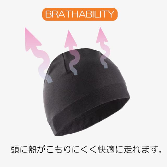 頭の熱をほどよく逃がし、熱がこもらない素材。速乾素材で、汗でべちゃべちゃにならない。