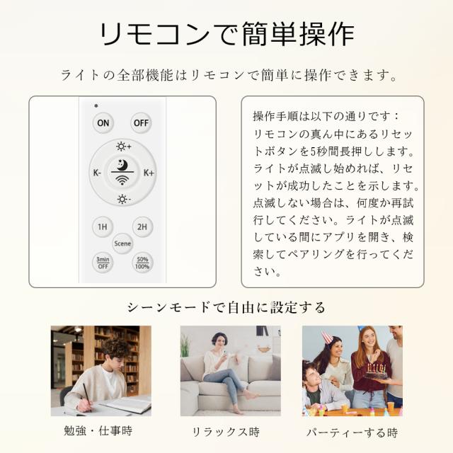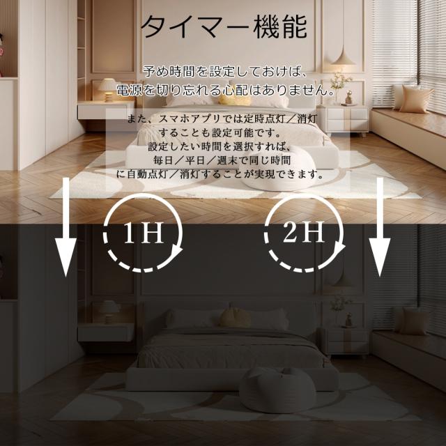 - リモコンでは1時間と2時間のタイマーボタンが付いています。設定したい時間を押すと、相応のカウントダウンが終了すると自動的に消灯できます。スマホでは【スケジュール】というところでカウントダウン時間を自由に設置ことができます。タイマー機能を使うと、時間をもっと便利に管理することができます。