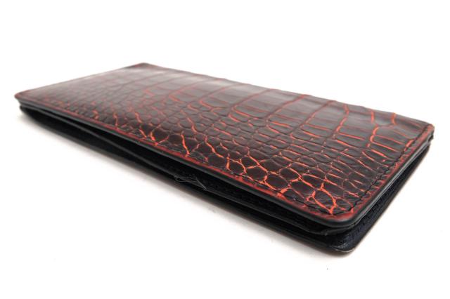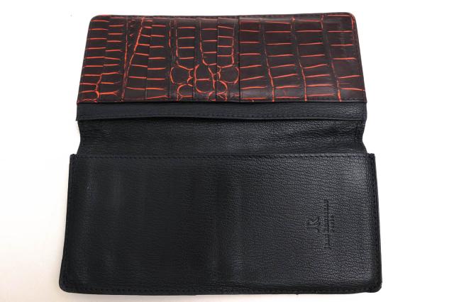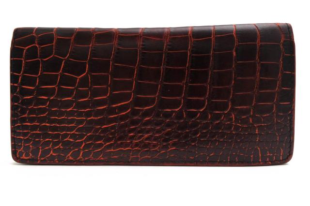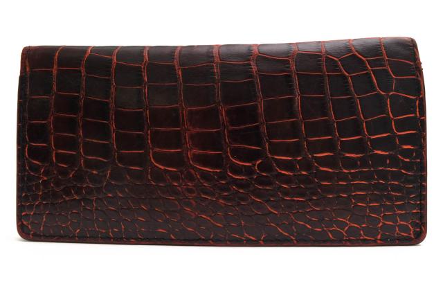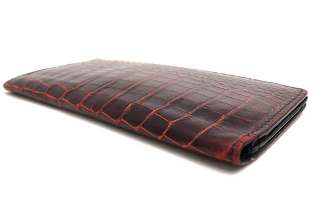 外装には高品質なルイジアナアリゲーターを贅沢に使用したロングウォレット。小銭入れのない、札入れとカードポケットのみのシンプルなタイプで、使い勝手はもちろん、スマートな見た目も魅力。スーツの内ポケットに入れても嵩張りにくく、大人の余裕を感じさせます。