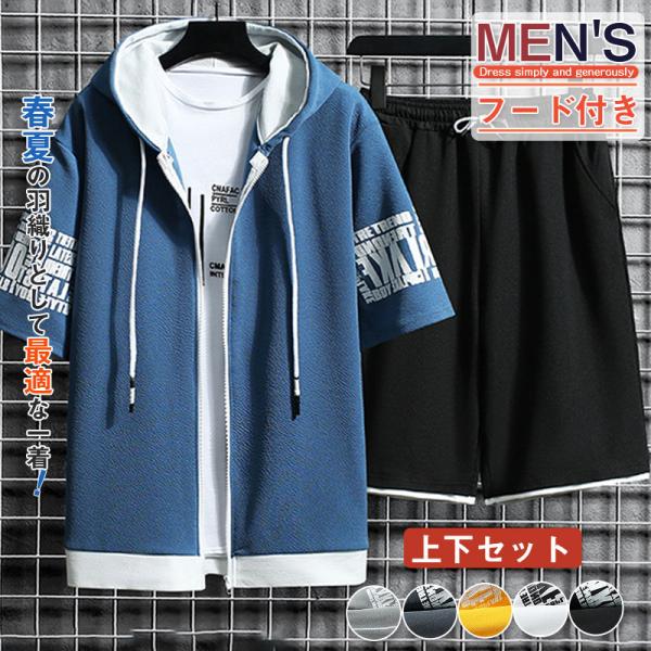 フード付 メンズ セットアップ 上下セット ジップアップ フード 半袖パーカー ショートパンツ 部屋着 運動着 夏 ゆったり 男性用 Tシャツ 父の日