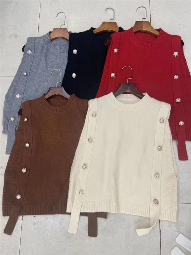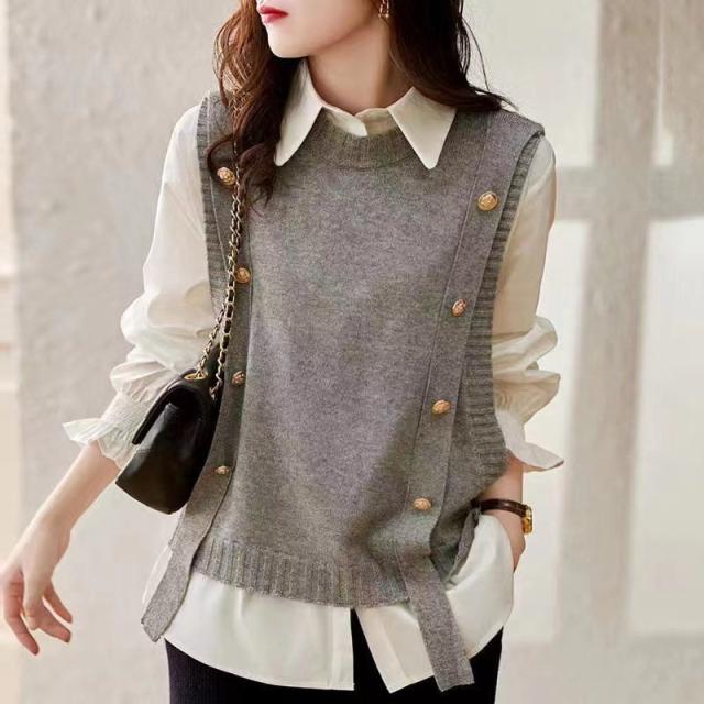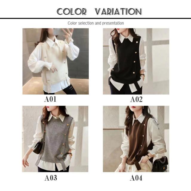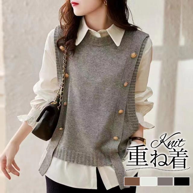 ベスト レディース ジレ ニット 秋 春 クルーネック 丸首 プルオーバー セーター ノースリープ レイヤード風 トップス 通勤 重ね着 オフィス