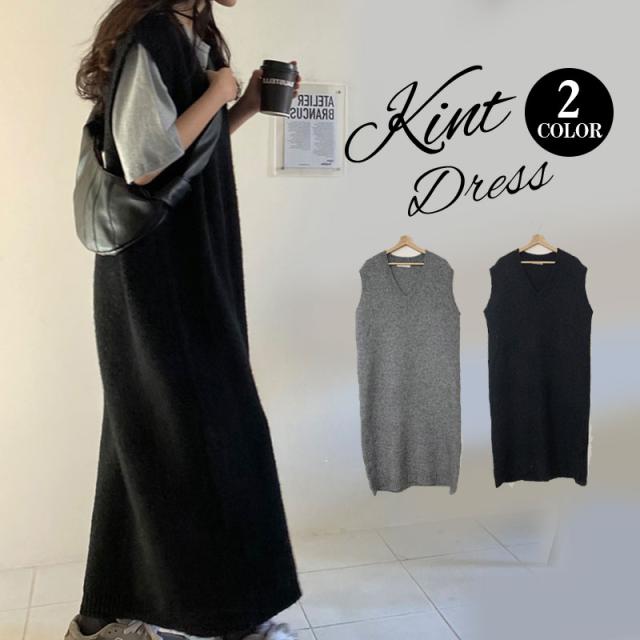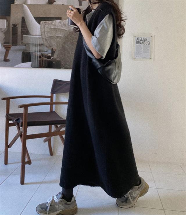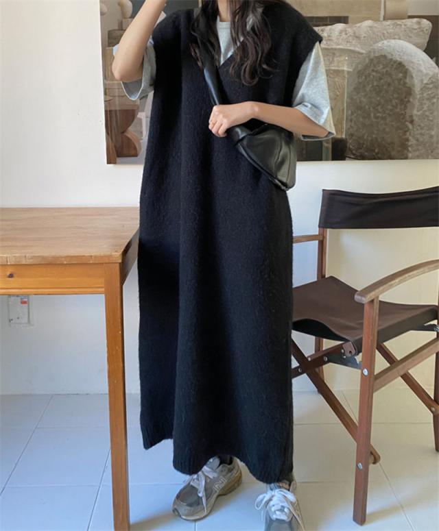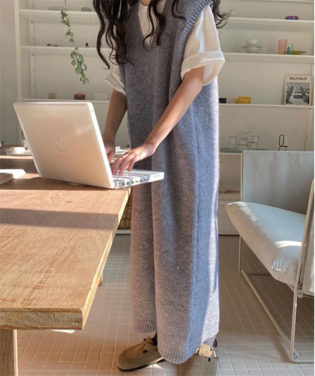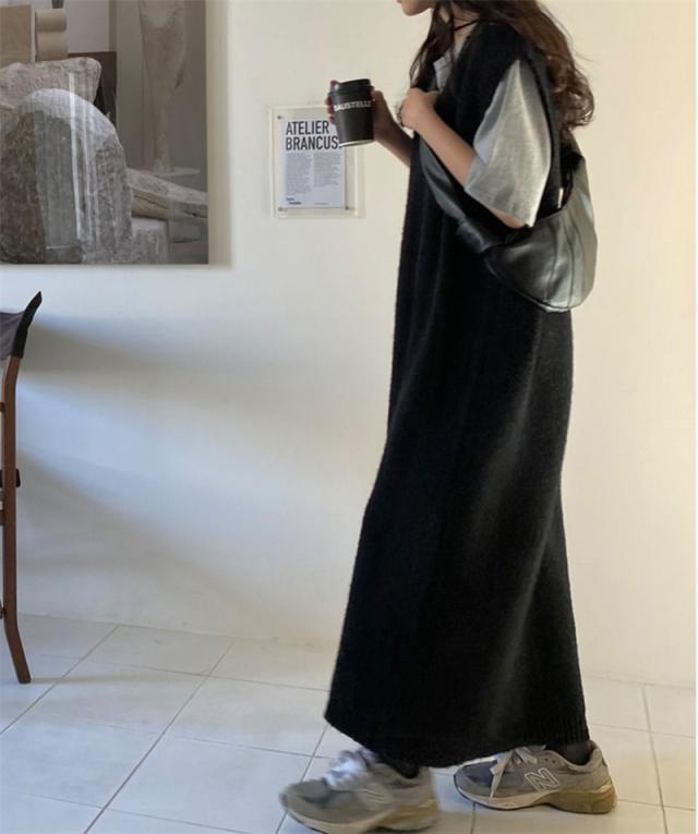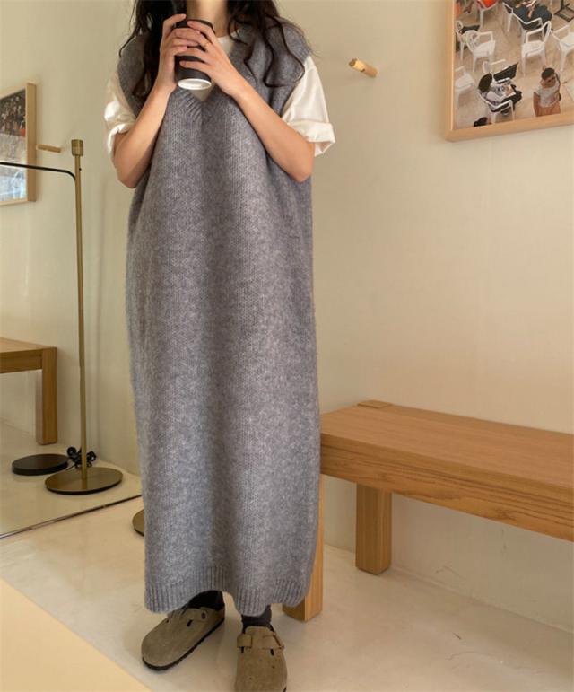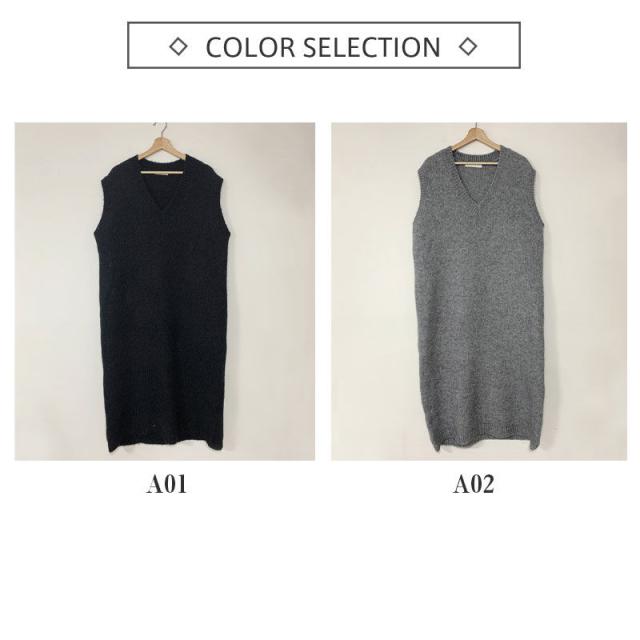 ニットベスト レディース ベストワンピース ロング トップス プルオーバー ゆったり レイヤード セーター ノースリーブ 体型カバー 重ね着 無地
