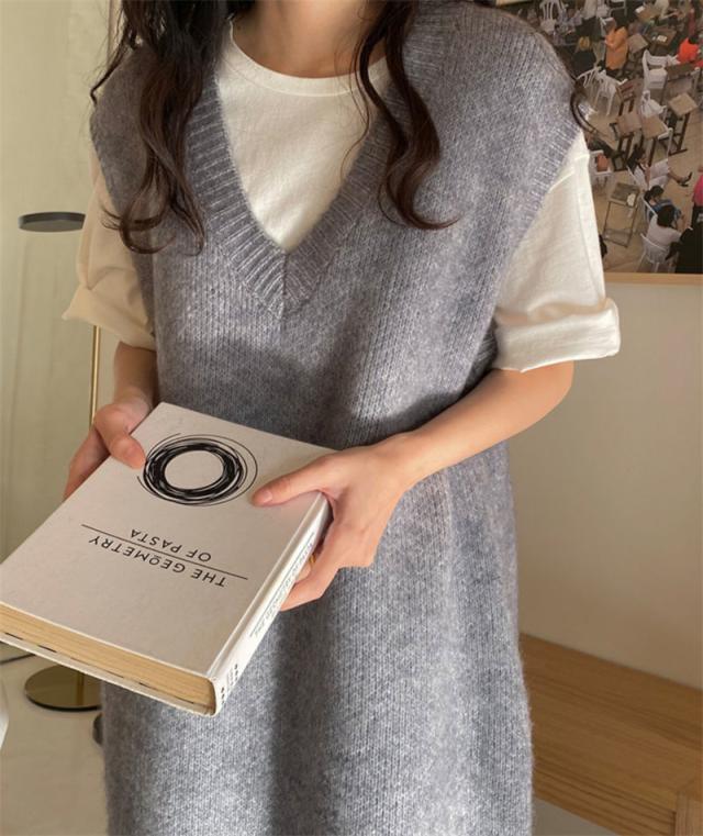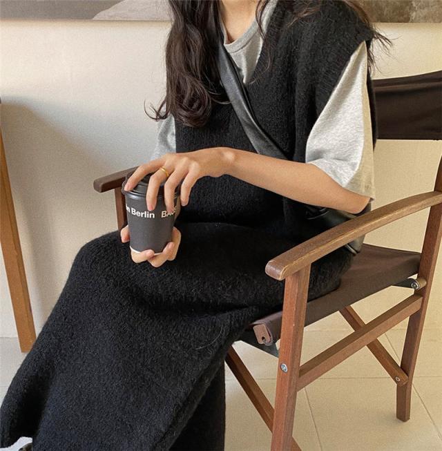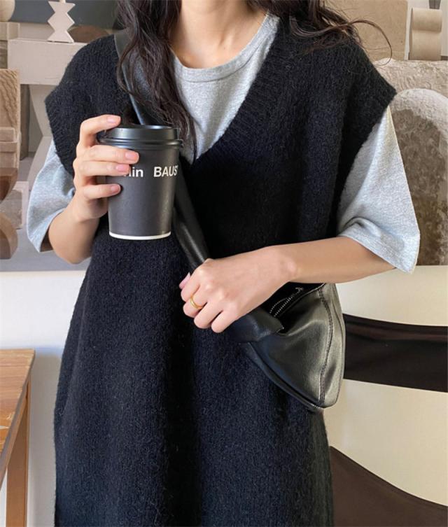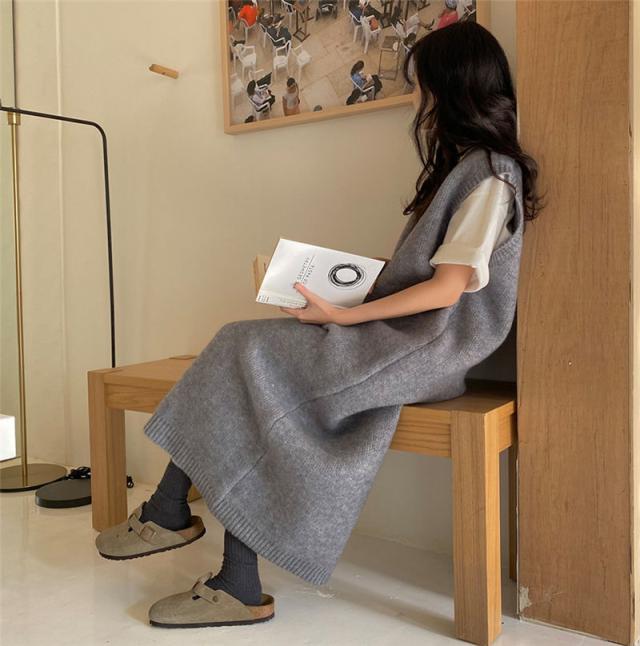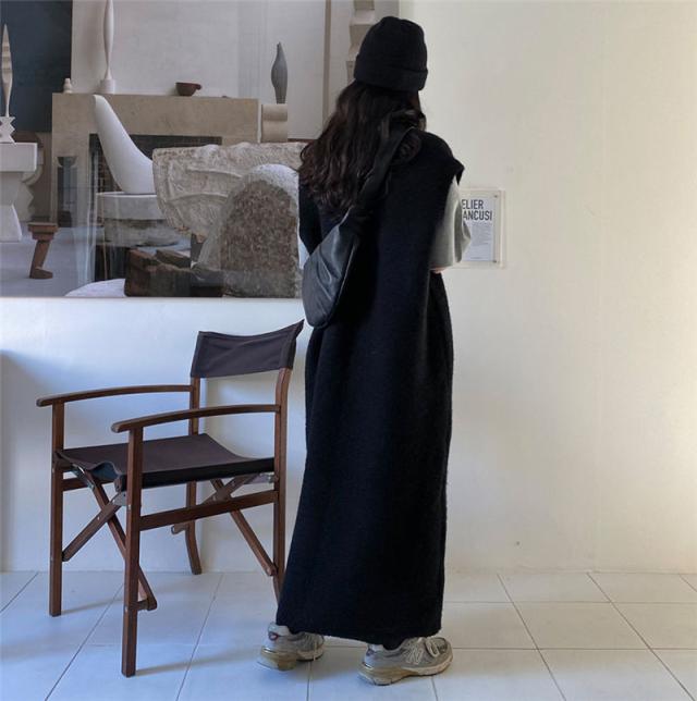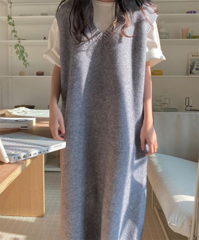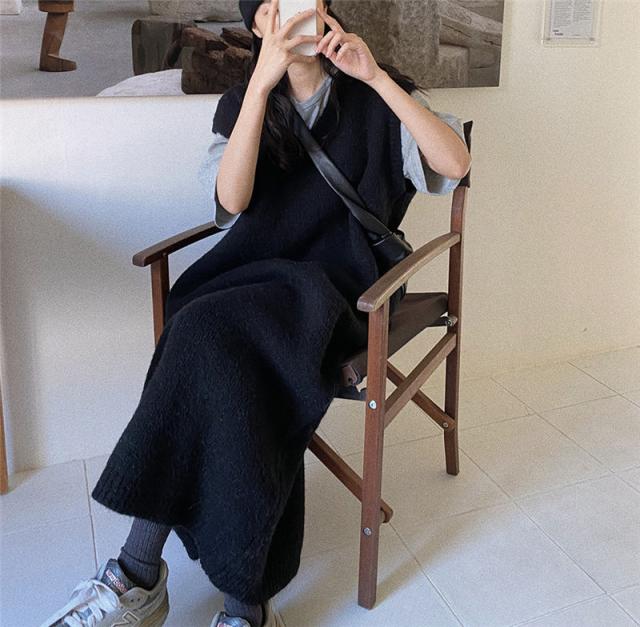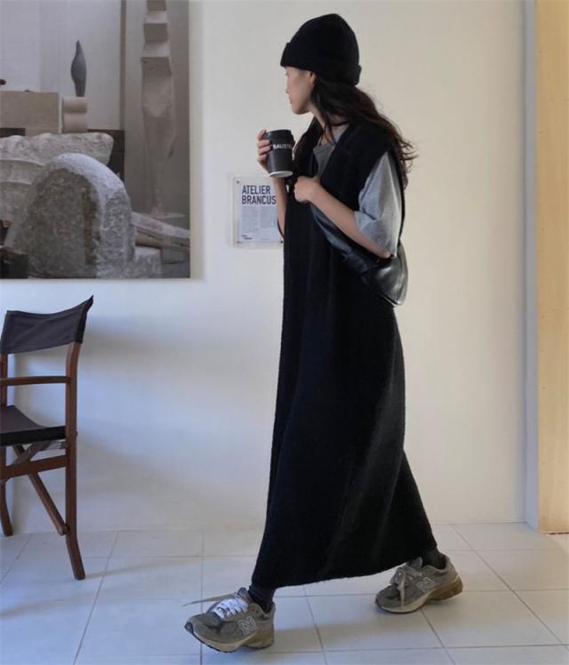 ニットベスト レディース ベストワンピース ロング トップス プルオーバー ゆったり レイヤード セーター ノースリーブ 体型カバー 重ね着 無地