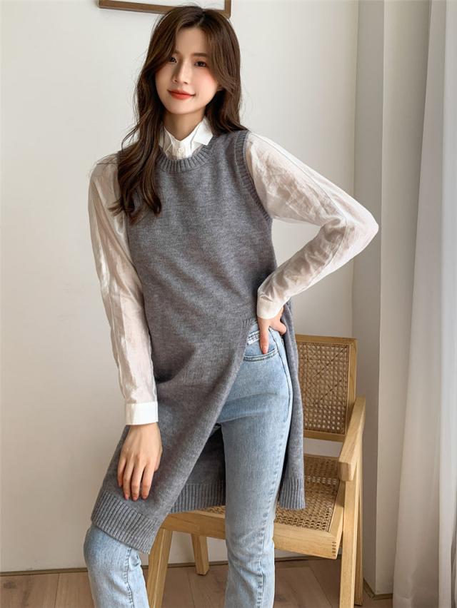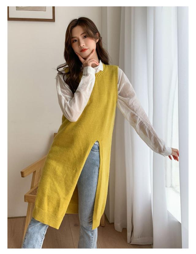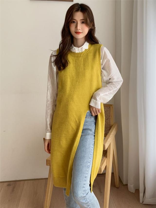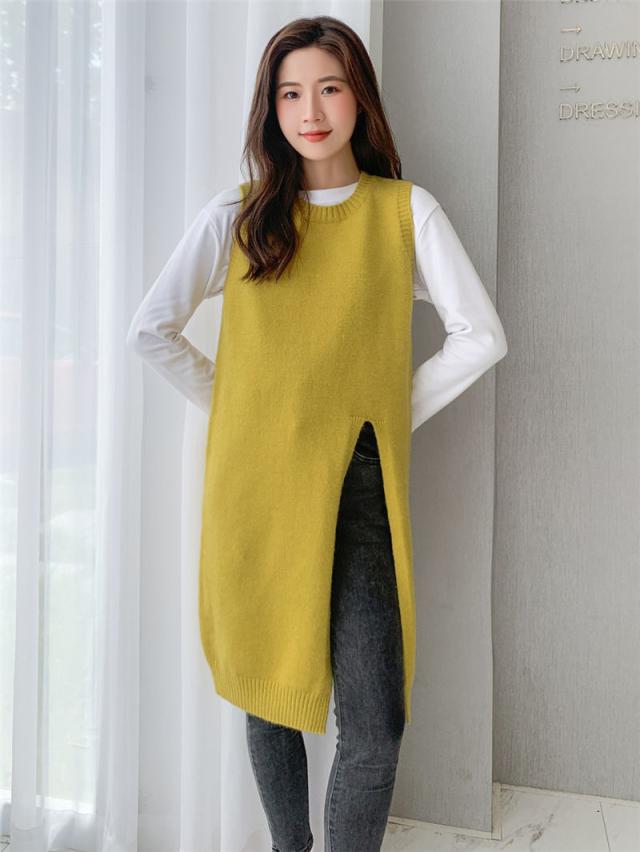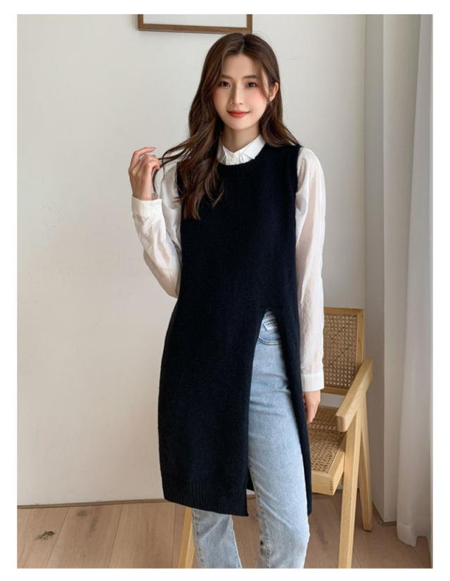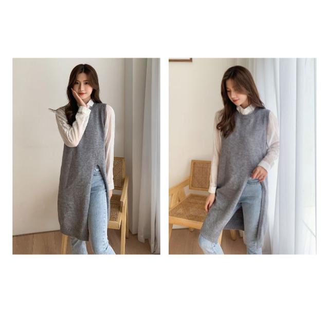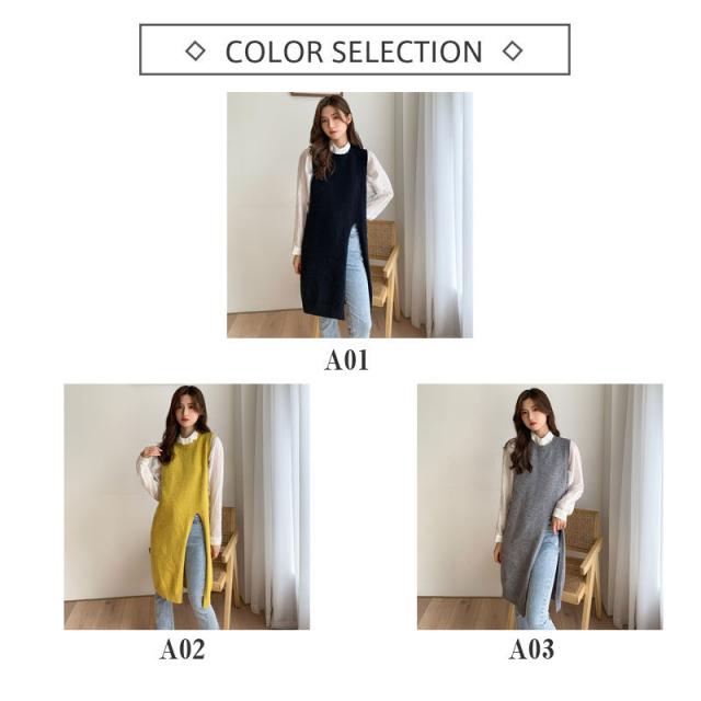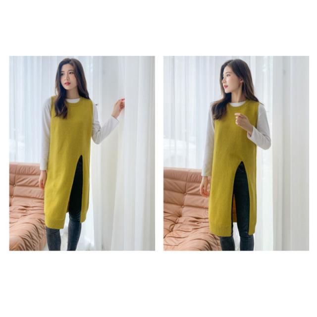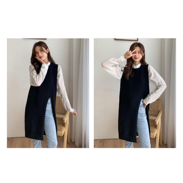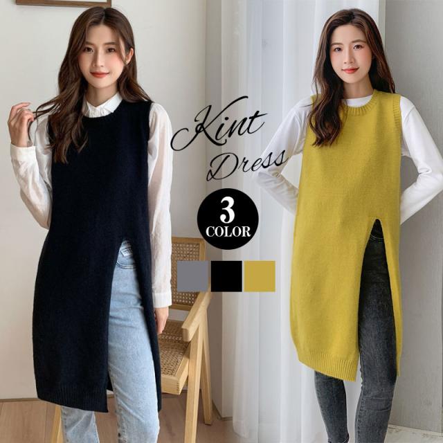 ニットベスト レディース ベストワンピース ロング トップス プルオーバー ゆったり レイヤード スリット ノースリーブ 体型カバー 重ね着 上品