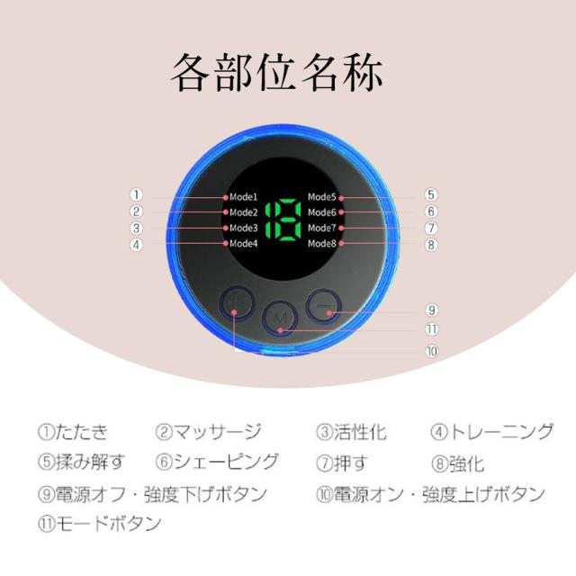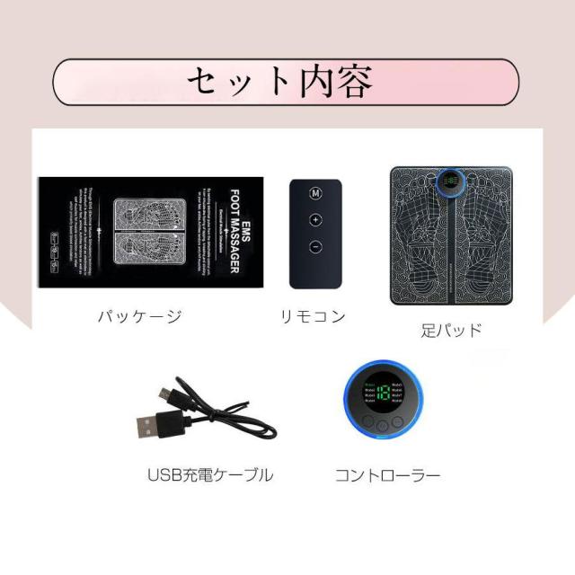 【セット内容】マッサージパッド、コントローラー、充電ケーブル、日本語取扱説明書。