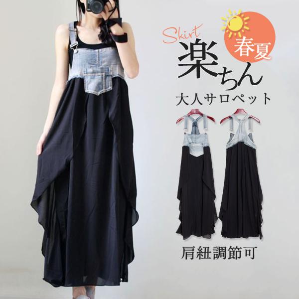 サロペット オーバーオール レディース ジャンパースカート デニム 異素材 肩紐調節可 ロング 重ね着 コーデ ゆったり 大きいサイズ 大人 お洒落