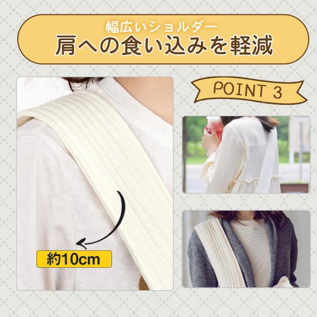 約10cmの幅広ストラップで肩に食い込むこともなく、長時間の抱っこも痛くなく、疲れにくく、とても楽です!