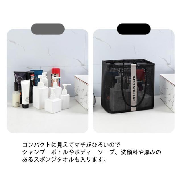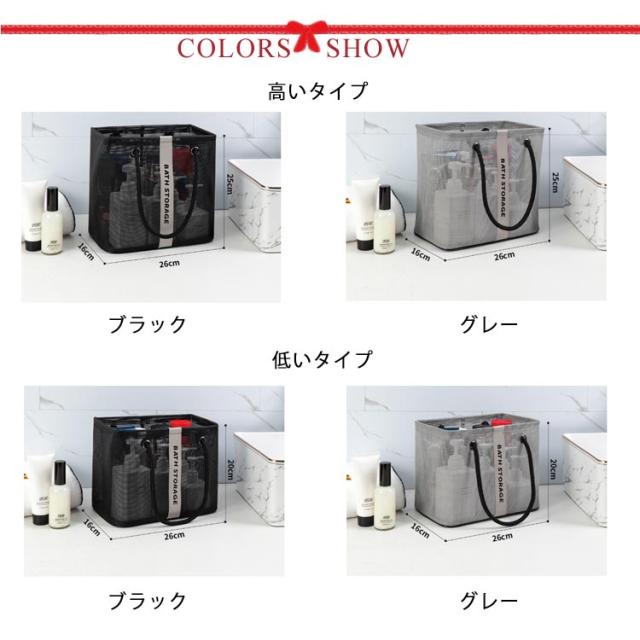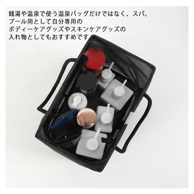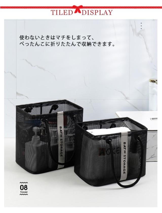 | 入浴/プール/温泉に欠かせないメッシュお風呂バッグ 使わないときはマチをしまって、ぺったんこに折りたたんで収納できます。 濡れた小物を入れても通気性が良いので、衛生的。 コンパクトに見えてマチがひろいのでシャンプーボトルやボディーソープ、洗顔料や厚みのあるスポンジタオルも入ります。 銭湯や温泉で使う温泉バッグだけではなく、スパ、プール用として自分専用のボディーケアグッズやスキンケアグッズの入れ物としてもおすすめです。 使わないときはマチをしまって、ぺったんこに折りたたんで収納できます。 全2色カラーでシンプルなデザインなので、男女兼用でご使用いただけます。 | |