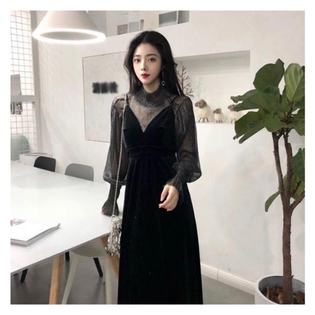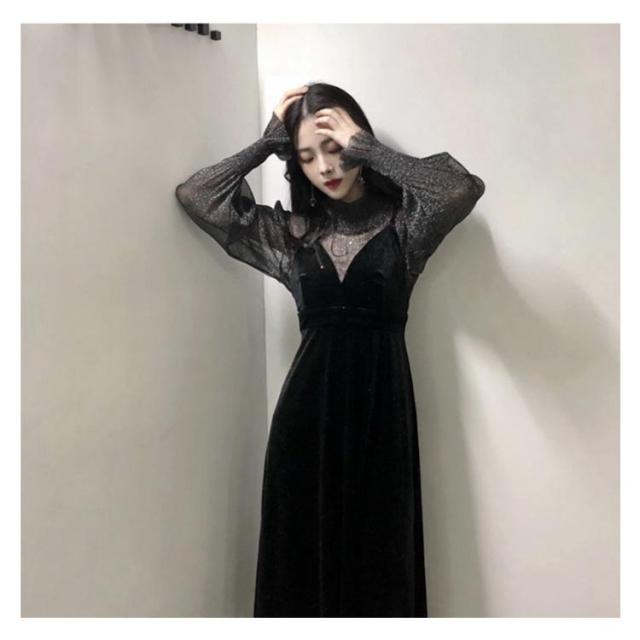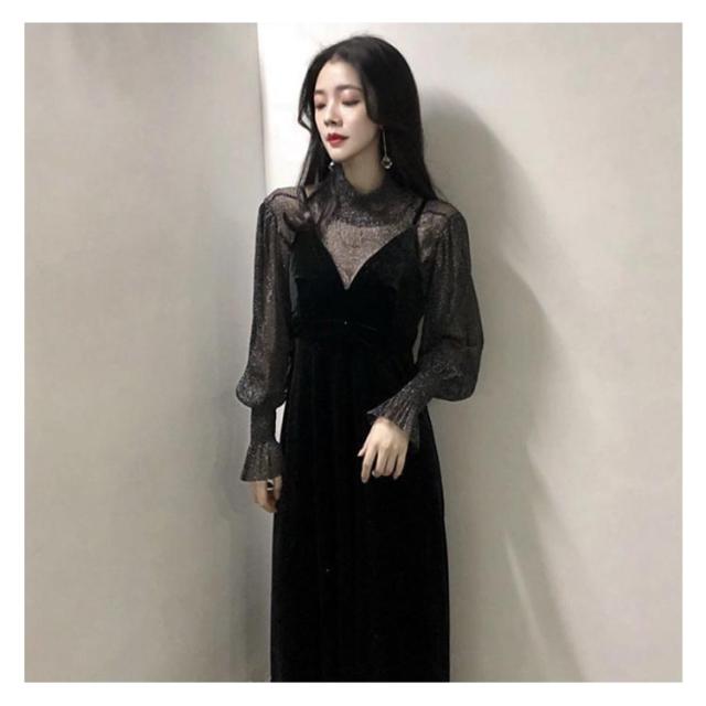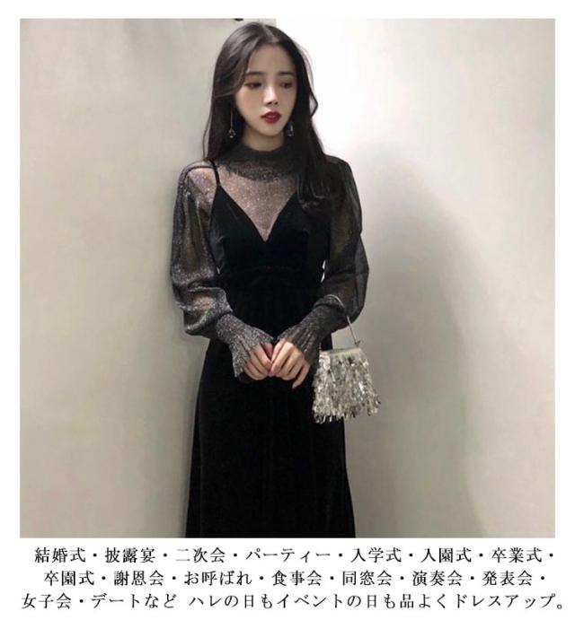 パーティードレス 結婚式 セットアップ ドレス ワンピース 韓国 レディース 春 秋 冬 お呼ばれ 成人式 二次会 同窓会 20代 30代 40代 シースルー キャミワンピース 黒 ラメ キラキラ プルオーバー トップス ベルベット風 ジャンパースカート 2点セット