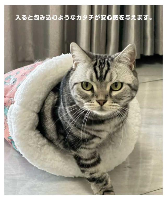 | 安心感に包まれる猫用寝袋 袋があると入りたくなってしまう習性に合わせた袋型のおふとん。 入ると包み込むようなカタチが安心感を与えます。 もこもこ暖かいボア素材を使い、寒い季節に大活躍。 やさしく包み込んで、内側の暖かさをしっかりキープしてくれる寝袋型だから、ペットも安心して眠れます、秋冬の寒さ対策としてぴったり! | |
