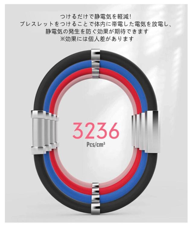 | 静電気除去ブレスレット 超強力! 防水機能 男女兼用 バチッ!とくる静電気から解放!静電気除去 ブレスレット 【商品説明】 ・シンプルでつかいやすいデザイン ・チタン&ゲルマニウム配合 ・2サイズで男女問わず使える ■POINT1 ・つけるだけで静電気を軽減! ブレスレットをつけることで体内に帯電した電気を放電し、静電気の発生を防ぐ効果が期待できます ※効果には個人差があります ■POINT2 ・体が整い、より健康的に! 体内の電流を整え、血液循環を活性化させ新陳代謝を促進する効果が期待できます ストレス解消で睡眠不足にも効果的! ※効果には個人差があります ■POINT3 ・シンプルでスタイリッシュ 日常生活に馴染み、様々なシーンで活躍します。 ■POINT4 ・柔らか防水機能 柔らかい素材なので装着がラクラク♪ シリコン製なのでシャワーや手洗いは汗をかくスポーツ時にもご使用いただけます | |