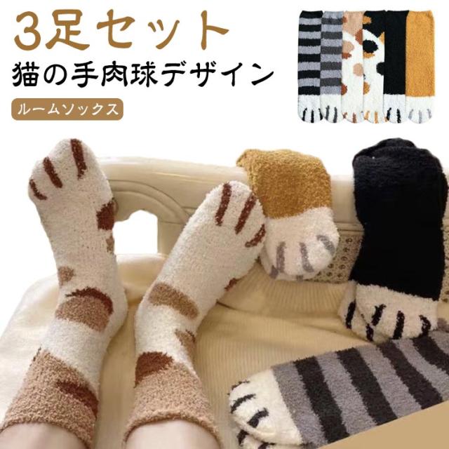 レディース 秋 冬 3足セット 猫の手肉球デザイン もこもこ 3足セット 厚手 ふわふわ 冷え対策 春 あったか ルームソックス 暖かい フリースボア靴下 防寒 男女兼用 中学生 マシュマロ靴下 おしゃれ クルー丈ルームソックス