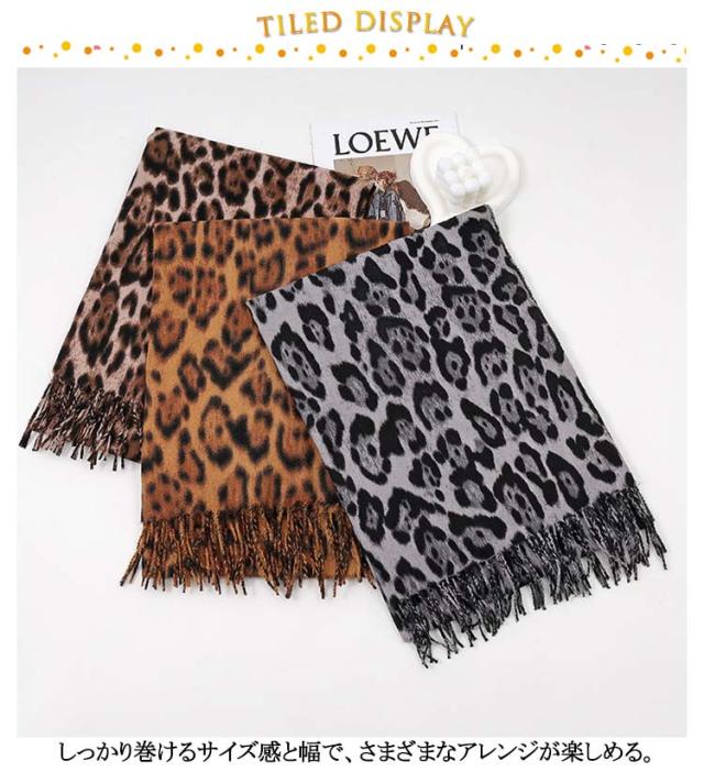 | 大判のレオパード柄マフラー しっかり巻けるサイズ感と幅で、さまざまなアレンジが楽しめる。 寒さ対策としてはもちろん、首にかけるだけで暗くなりがちな冬コーデのアクセントにも。 プレゼントやギフトにもオススメ。 | |