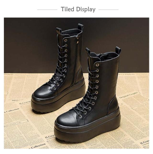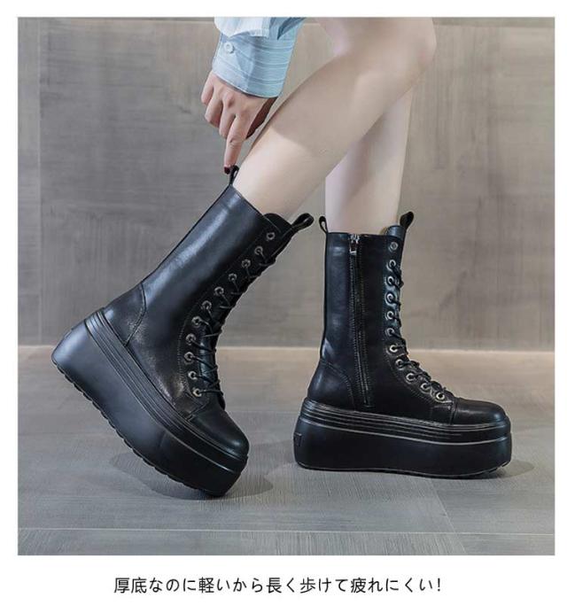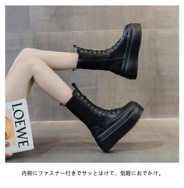 | 8cm身長アップ!歩きやすい厚底編み上げブーツ。 内側にファスナー付きでサッとはけて、気軽におでかけ。 厚底なのに軽いから長く歩けて疲れにくい! 少しの汚れならサッと拭けばキレイになって、お手入れらくちん! マニッシュなパンツスタイルはもちろん、スカートやワンピースの可愛い系コーデにも良く合います! | |