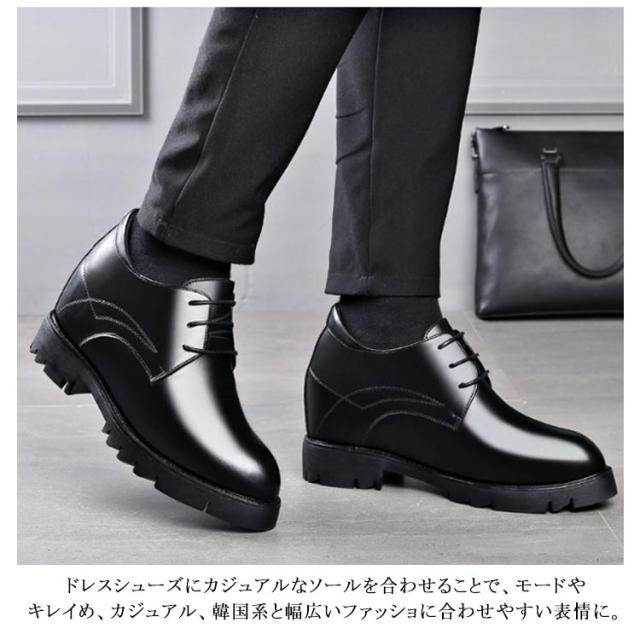 | 12cm身長アップ!背が高くなるシークレットシューズ。 スーツをカッコよく着こなす脚長スタイルを実現してくれます! ドレスシューズにカジュアルなソールを合わせることで、モードやキレイめ、カジュアル、韓国系と幅広いファッショに合わせやすい表情に。 すっきりとしたシルエットでミニマルなアッパーと、無骨な厚底ソールのミスマッチが足元に存在感をプラスしてくれる。 衝撃吸収のインソールと、軽量で履き心地がよく歩きやすいので、タウンユースは勿論、カジュアルシーン、旅行などにも最適! コーディネート問わず様々なスタイルに取り入れやすいので、幅広いシーンで活躍してくれる大人のスタイリングに欠かせないクラシックな風格の大人ドレスシューズです。 | |