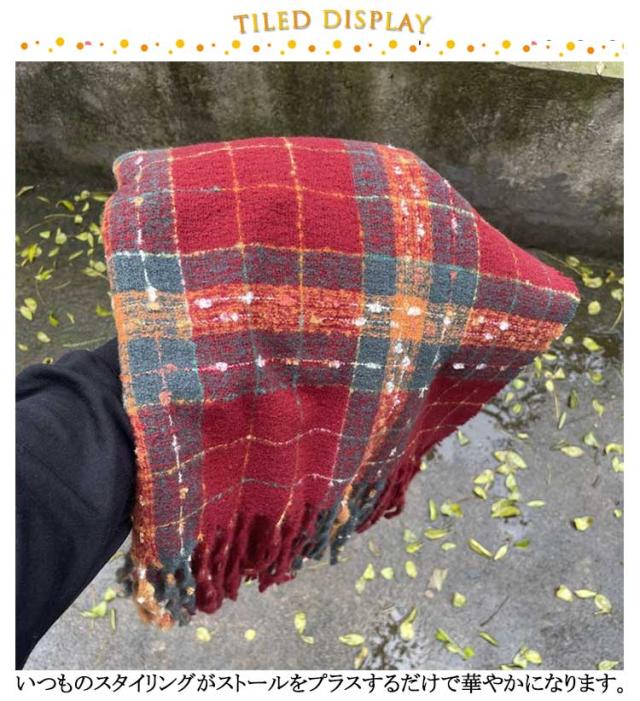 | カラバリ豊富なチェック柄&千鳥柄の大判ストールが今年も登場! いつものスタイリングがストールをプラスするだけで華やかになります。 大判サイズなので色んな巻き方ができ、アレンジを楽しめます。 首に巻くだけでなく、ショールやひざ掛けとしても使用できるので、様々な場面で活躍すること間違いなしのアイテムです。 冷房や冷え対策にサッと羽織ることもできます。 なめらかな肌触りで、チクチクとした不快感がありません。 ユニセックスにお使いいただける着回し性の高いデザインで、プレゼント・ギフトにもオススメです。 | |