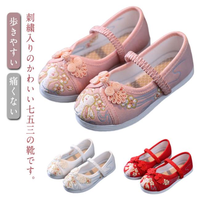 可愛い 七五三 キッズ 女の子 草履のかわりに履ける 痛くない 子供 女児 靴 子供 和柄の靴 かわいい うさぎ お正月 刺繍 子供 こども 三歳 七歳 着物 和装 和服 履物 履きやすい フラットシューズ