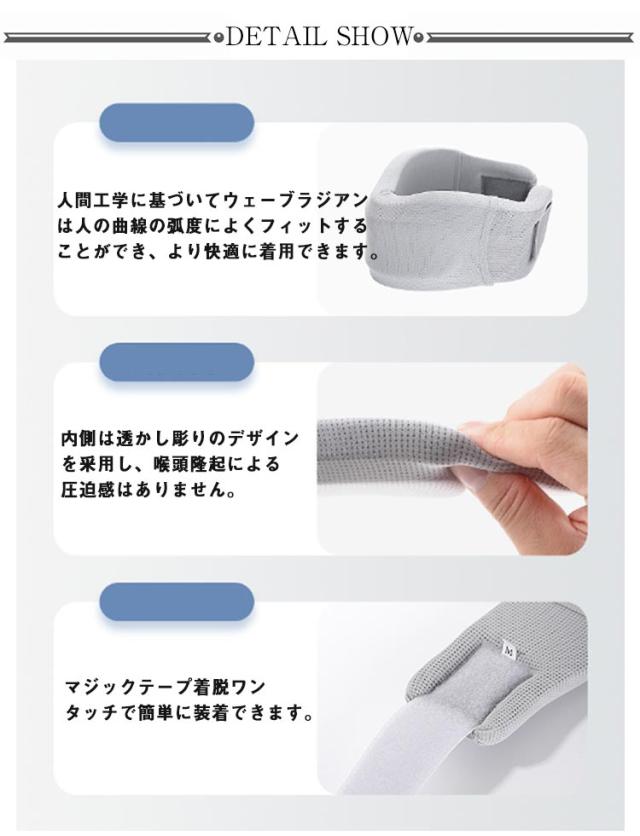 | 【サイズ】サイズ:女性用M、男性用L。洗濯可能なカバー付きです。 【新世代・首 サポーター】首にかかる負担をスゥーっと休息させる 首 サポーターです。弾力性のあるスポンジで頸椎(首の骨)にアプローチします、人間工学に基づいて設計されたカーブが首にフィットするため、首のラインを正しくサポートします。中央には柔らかなサポートが組み込まれているため、サポートを2倍にし、頭からの首への圧力を軽減します。 【ネックブレースのデザイン】1.人間工学に基づいてウェーブラジアンは人の曲線の弧度によくフィットすることができ、より快適に着用できます。2.内側は透かし彫りのデザインを采用し、喉頭隆起による圧迫感はありません。3.マジックテープ着脱ワンタッチで簡単に装着できます。4.肌にやさしいアイスシルク生地を使用し、快適な着け心地。 【生活大活躍】疲れを感じた時に、お昼寝などの睡眠時に、長時間の仕事時にこの首サポーターを使ってください。使用シーン:デスクワーク、勉強時、長時間の新幹線や飛行機、睡眠時などにご使用いただけます。頸部の倦怠感やこわばり、痛みを和らげます。 | |